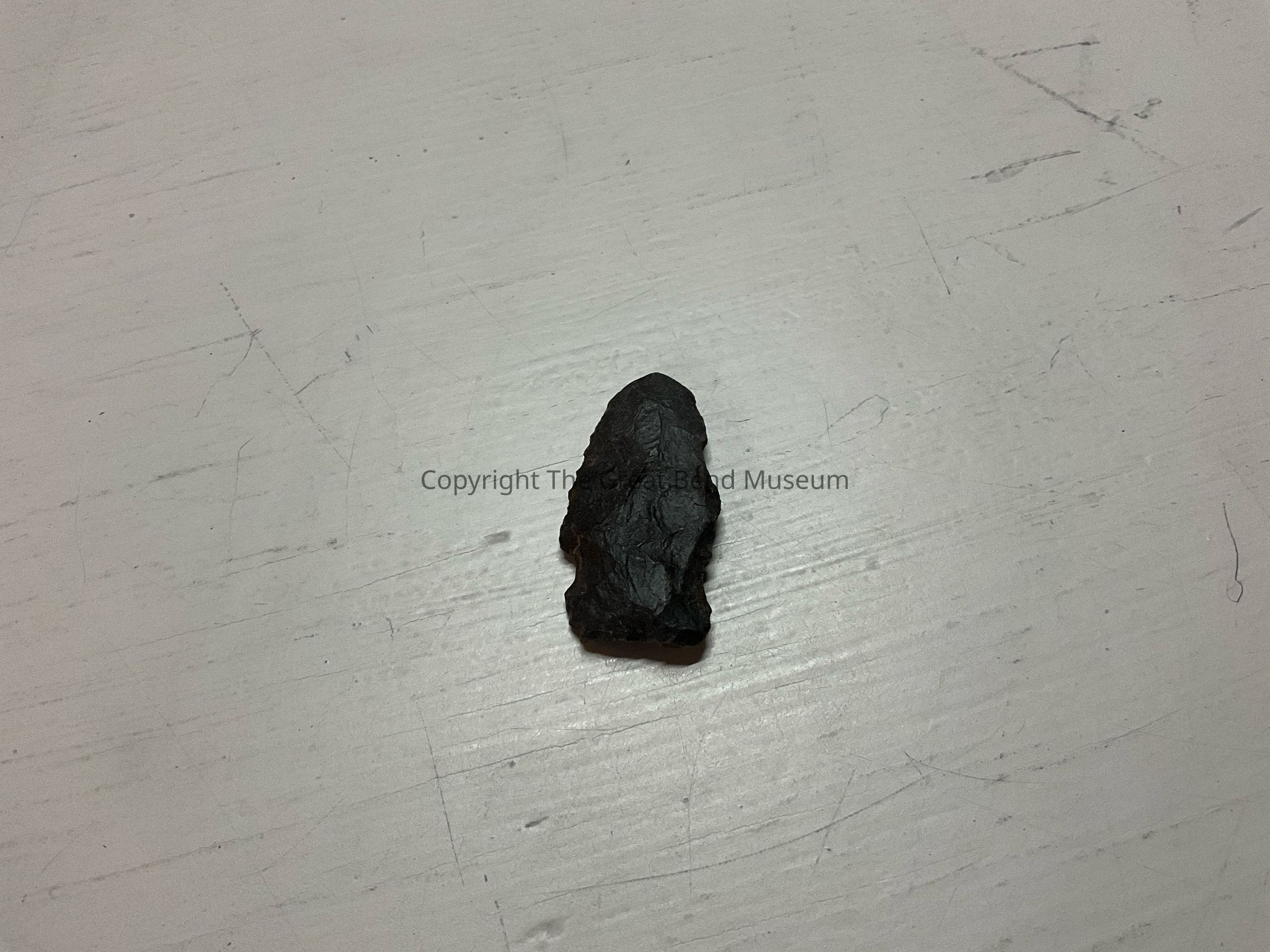 Light gray/brown leaf shaped/triangular shaped blade.blade is concave in the center.basal edge of stem has a Knick on one side.weak shoulders and stem is slightly flared. Basal edge has been ground.Made/Created