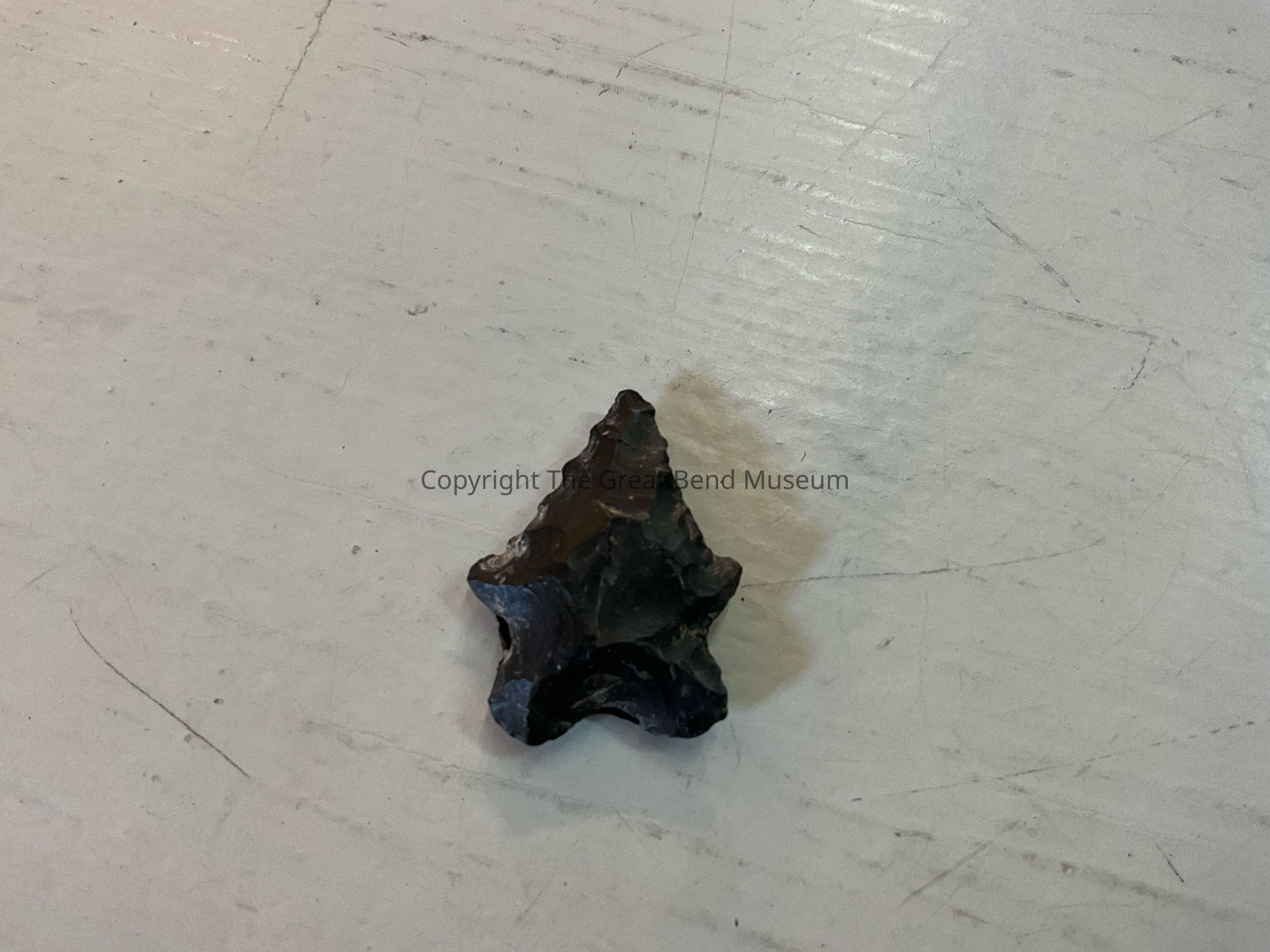 Black, small thin, bifurcated point. Blade edges are serrated, stem sides are straight to slightly flared. Stem is bifurcated. Point is thicker in the middle.Acquisition
