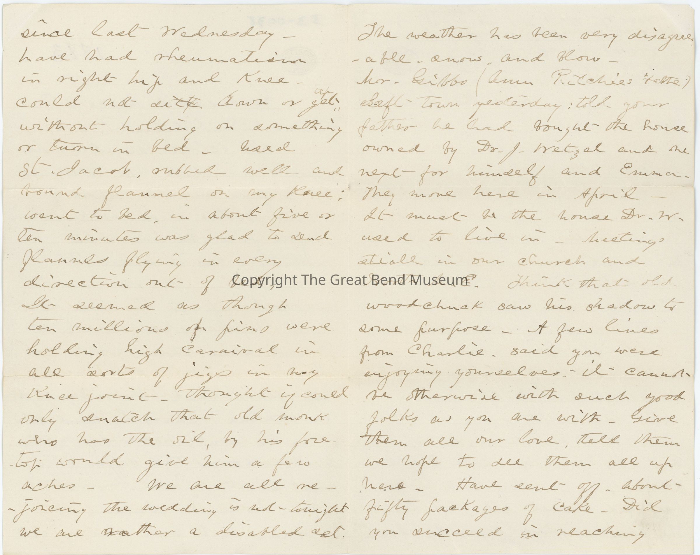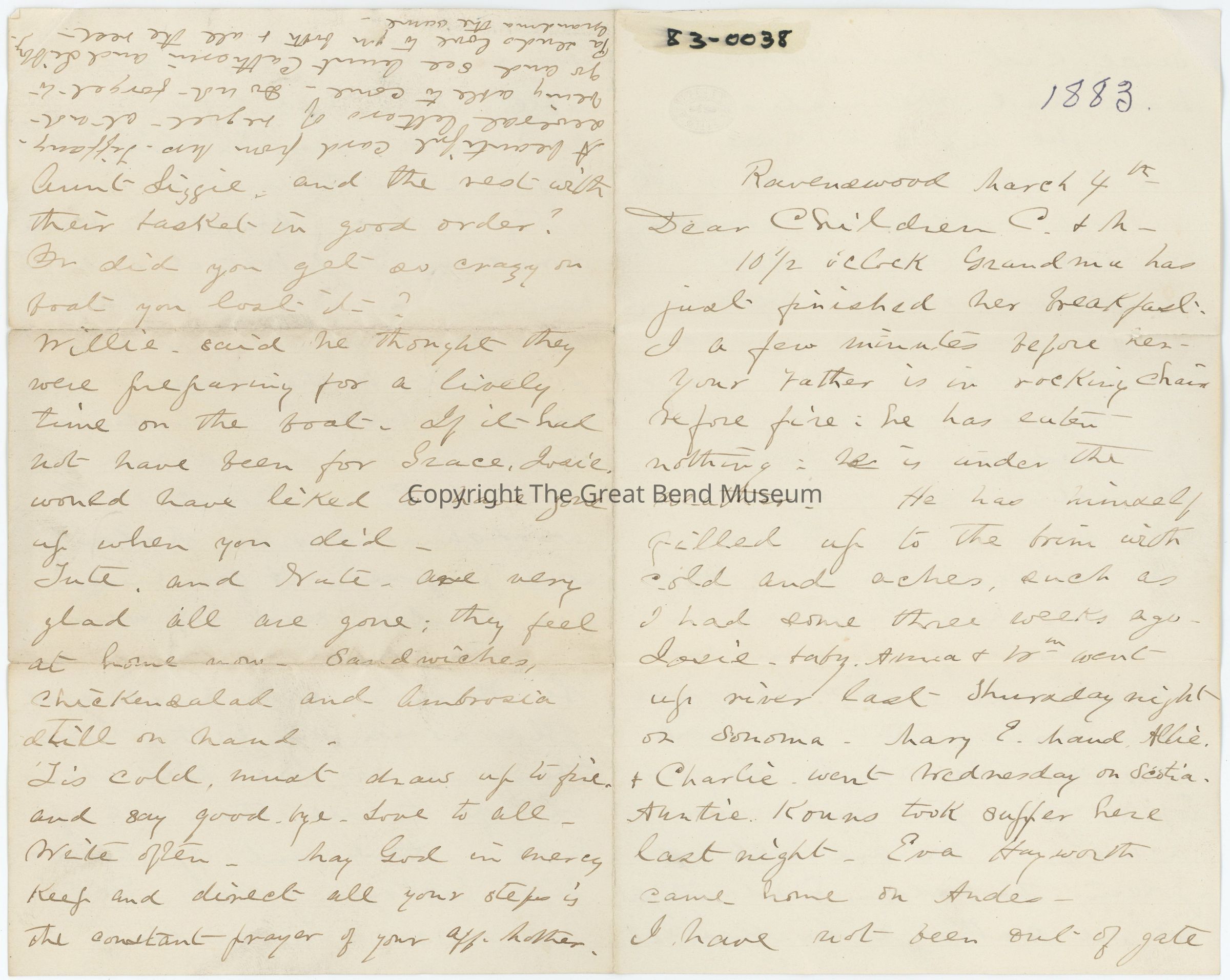 1883- Ravenswood March 4th- Dear children (C&M?) 10 1/12 o'clock- grandma has just finished her breakfast. I have a few minutes before her. Your father is in Rocking Chair before fire he has eaten nothing he is under the weather he has himself filled up to the brim with a cold and aches, such as I had some 3 weeks ago. Josie's baby, Anna and I went up River last Thursday night on S_____. Mary_ Allie(?) & Charlie went Wednesday on s_____. Auntie Kouns (?) took supper here last night. Eva Hayworth came home on _____. I have not been out of gate since last Wednesday have had rheumatism in night hip and knees could not sit down or get up without holding on to something turn in bed used Saint Jacob rubbed well and bound flannel on my knee: went to bed and in five or ten minutes was glad to send flannels flying in every direction out of the bed. It seemed as though ten million of pins were holding high carnival in all sorts of jigs in my knee joint- thought if I could only snatch that old monk who has the oil by his fore top(?) I would give him a few shakes. We are all rejoicing that the wedding is not tonight we are rather a disabled set. The weather has been very disagreeable snow and blow here. Gibbs (Ann Richie's father) left town yesterday told your father he had bought the house owned by Dr. J. Wetzel and one next for himself and Emma. They move here in April. It must be the house Dr W. used to live in. Meeting s______ in our church and North M. E. think that old woodchuck saw his shadow to some purpose. A few lines from charlie. Said you were enjoying yourselves it can't be ________ with such good folks as you are with. Give them all of our love tell them we hope to see them all up here. Have sent off about 50 packages of cake. Did you succeed in reaching aunt _____ and the rest with their basket in good order? Or did you get as crazy in the boat and lost it? Willie said he thought they were preparing for a lively time on the boat. If it had not have been for Grace (?) ______ would have liked to have gone up when you did. ______ and _________ are very glad all are gone; they feel at home now. Sandwiches, chicken salad and ambrosia still on hand. Tis cold. Must draw up to the fire and say good bye. Love to all. Write often. May God in mercy keep and direct all your steps is the constant prayer of your aff (short for affectionate) mother. (The upside down portion of the letter) A beautiful card from ____ Tiffany. Several letters of regret at not being able to come. Do not forget to go and see Aunt Cathrine and Libby. Pa sends love to you both & all the rest. Grandma the same.Date(s) of Creation