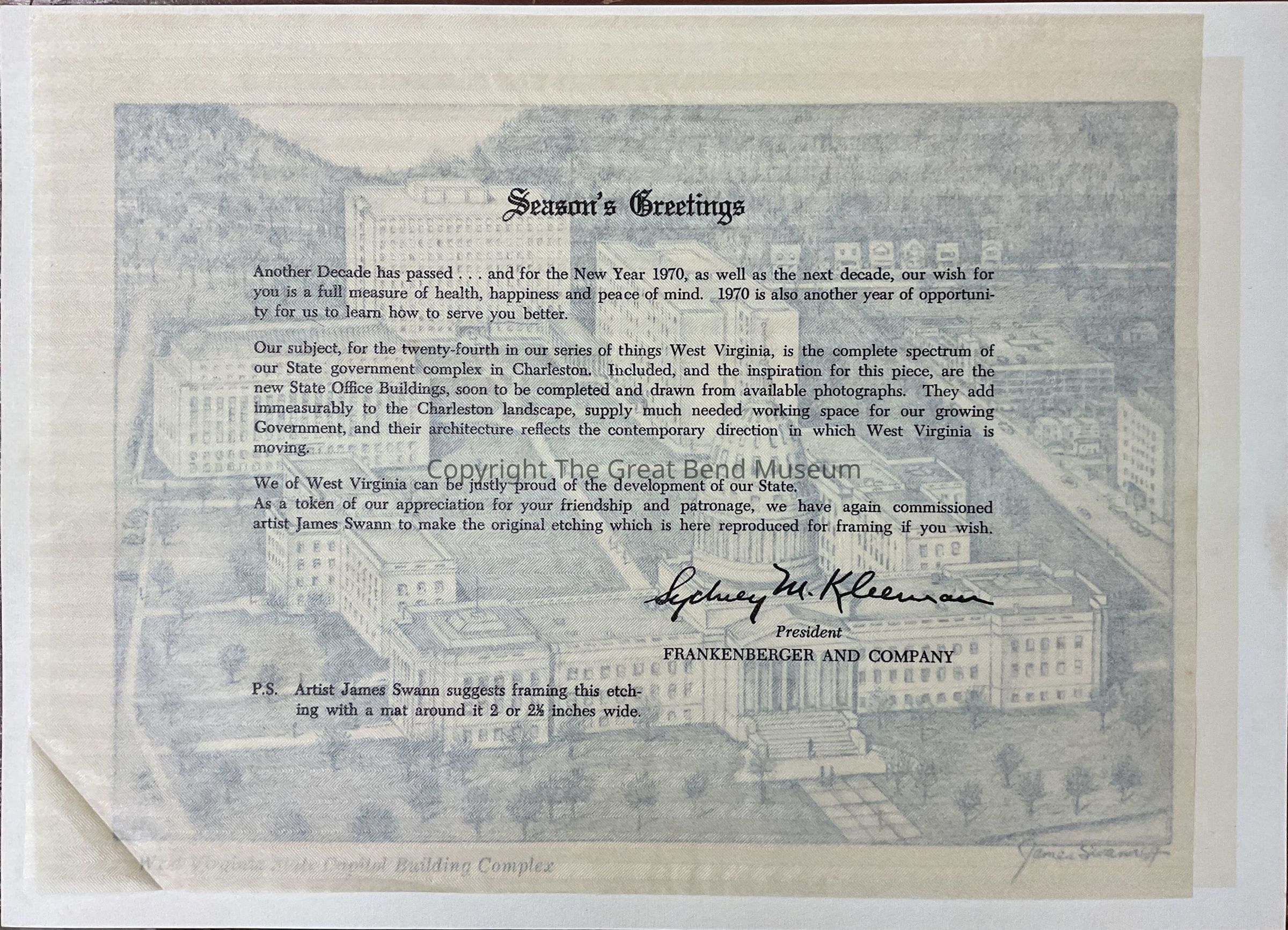 Letter from Sydney M. Kleeman(?) with drawing of the West Virginia State Capital attached