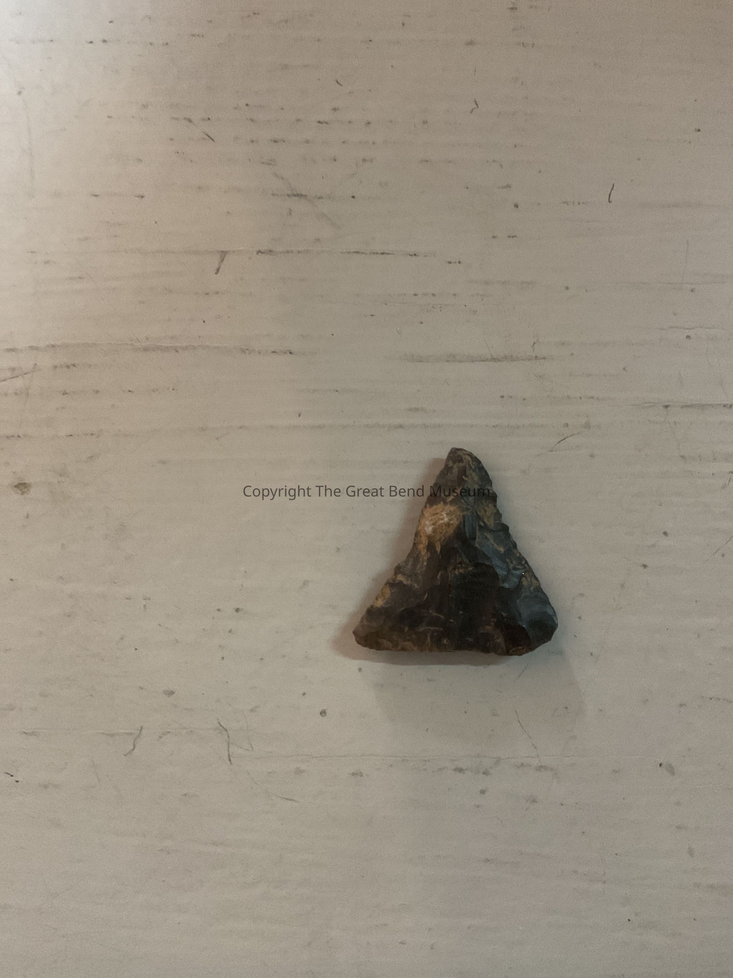 Small dark gray, equilateral shaped triangles point. Base has been worked and has straight edge. Edges are somewhat serrated due to resharpening.Acquisition
