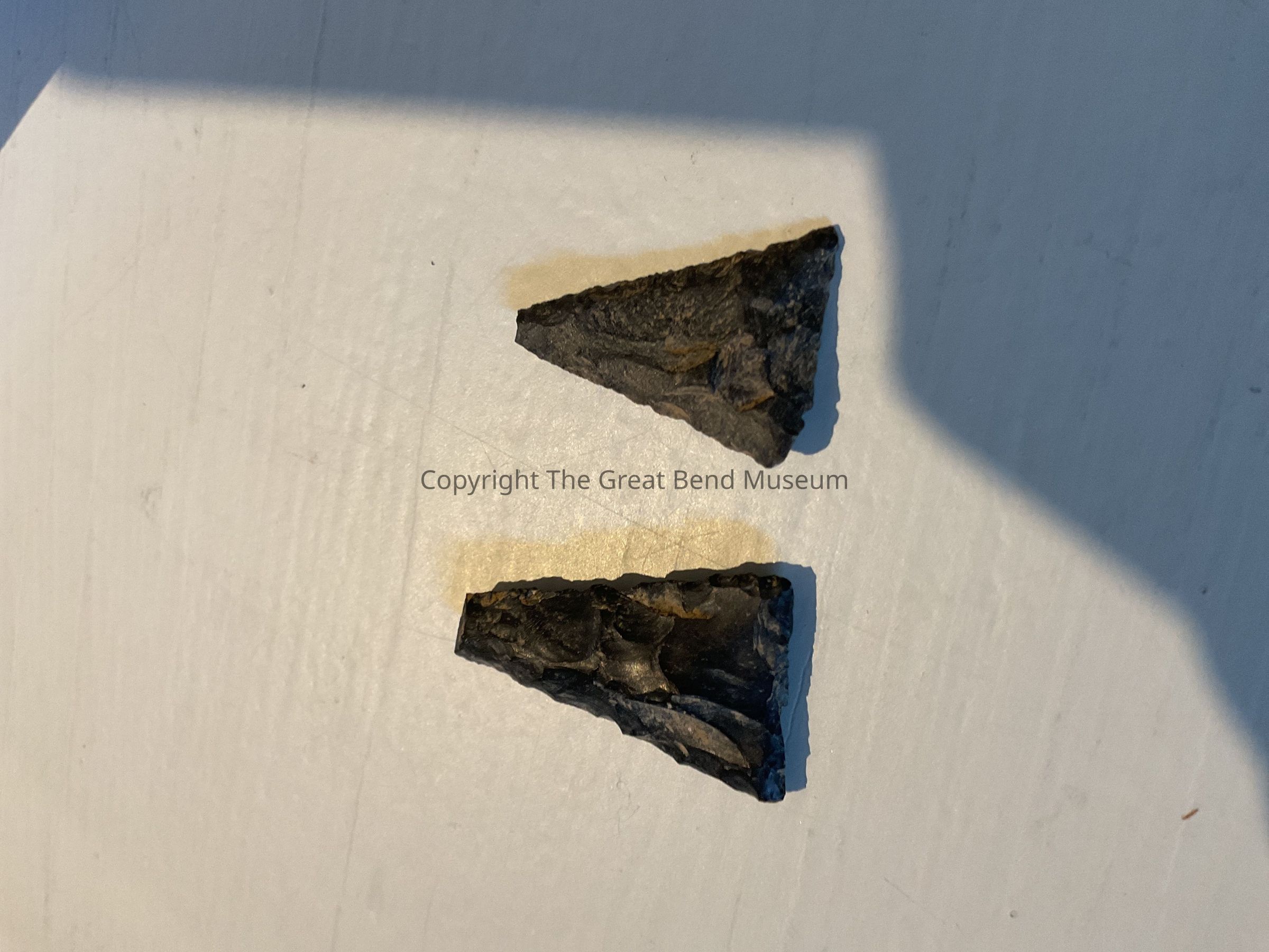 2 small black Isosceles shaped blades. Sides are slightly serrated due to reshaping. Tips of both points are chipped. Basal edge is straight and ground smooth.Made/Created