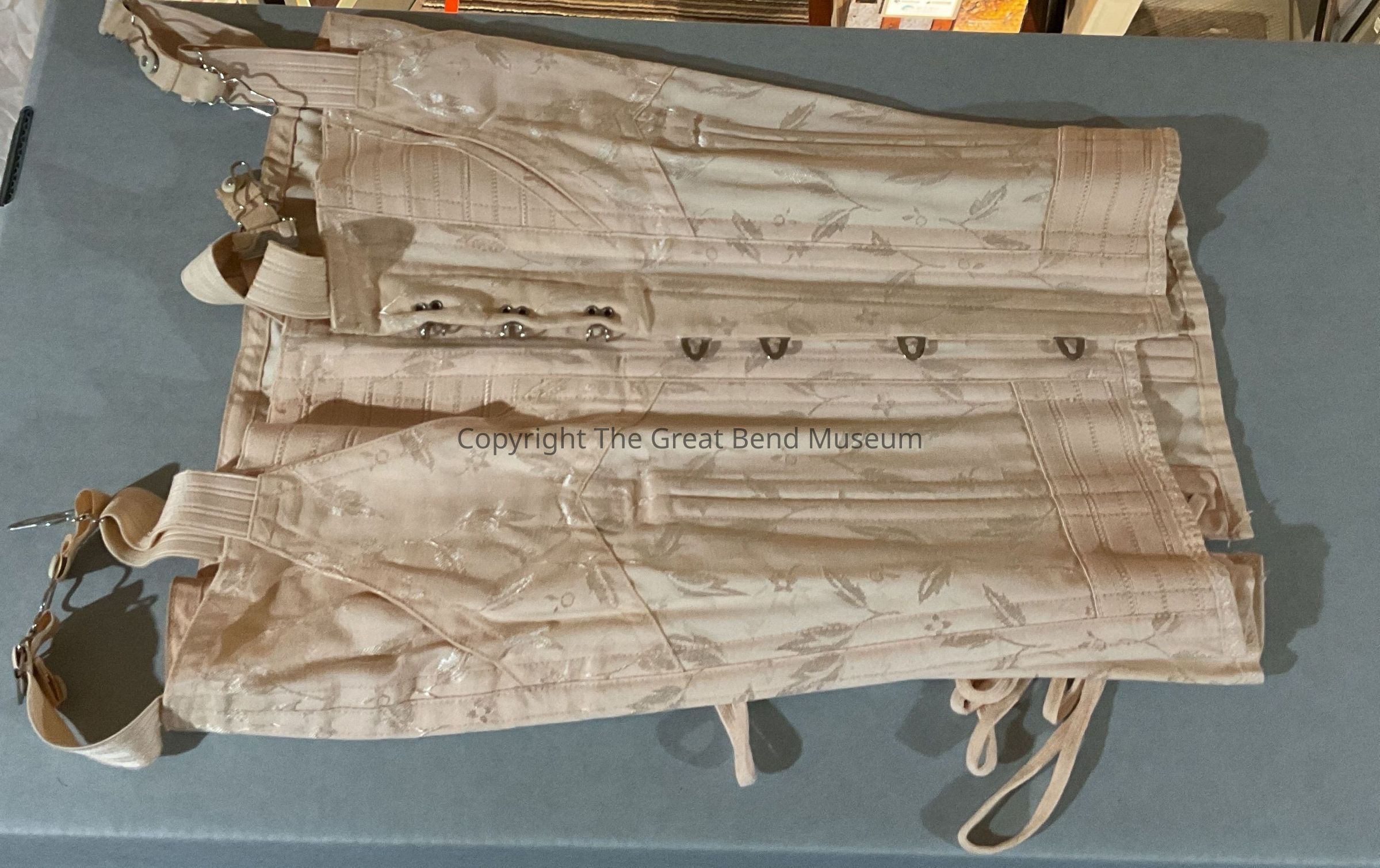 Light pink corset with metal buttons and elastic garter straps. No missing snaps or straps. No fraying or tearing. Manufacturer tag: Carol Brent Foundations.Made/Created