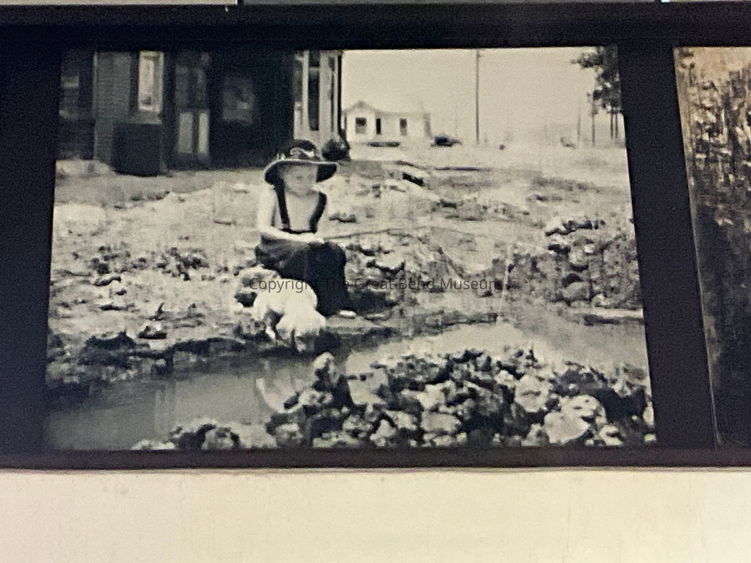 Little boy fishing in a mud hole in the middle of a dirt road/ street in Ravenswood. A puppy is drinking from the water. The boy is wearing long pants with suspenders, no shirt, and a cowboy hat. Fishing pole is a stick with string. The road looks to be under construction in front of the Alpine or Jur Theatre. There is a white house in the background, car, and electric poles.Acquisition