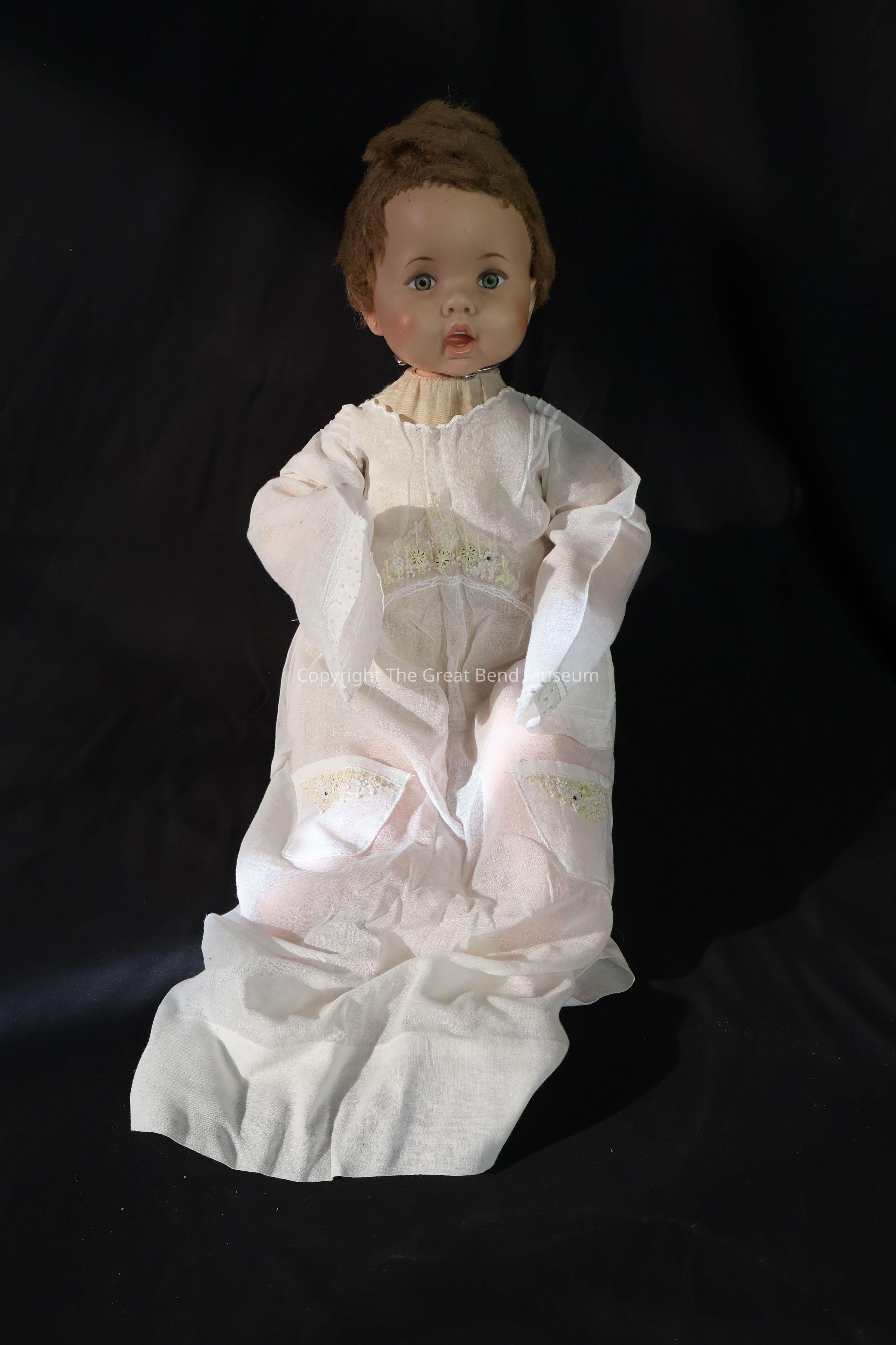 Cloth body, plastic arms, legs, head Face -- brown eyebrows, glass eyes - green, mouth is open showing 2 upper teeth, rosy cheeks. Hair is straw color, has been cut probably a child (Not a good cut).Acquisition