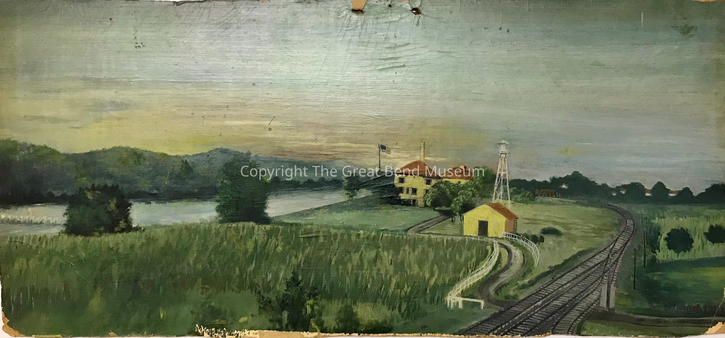 Overall, the painting is in fair condition. The cardboard support is degraded, brittle, and exhibits numerous areas of damage around its edges and the perimeter of the surface. There are two holes in the support with associated loss to the paint layer at the top, center (see right). There is a diagonal split in the lower right corner that is vulnerable to loss and visually distracting. The split is adjacent to a 1” x 1 ½” loss to the topmost painted surface. There is also an old crease with a raised edge in the lower left corner. The paint layer is generally in good condition apart from areas of horizontal cracking at the top center that appear to be slightly lifting from the cardboard surface. There are also small amounts of matte overpaint concealing old areas of damage and splatter in the green foreground and background. The painting exhibits heavy soiling, stray marks, and abrasions overall. Water damage has caused lighter vertical streaks, mainly visible through the sky. Contact with a previous matboard has cause matburn on surface of the painting. The matburn affects the other ~1” of the composition and is most visible along the top, left and right edges (see below).