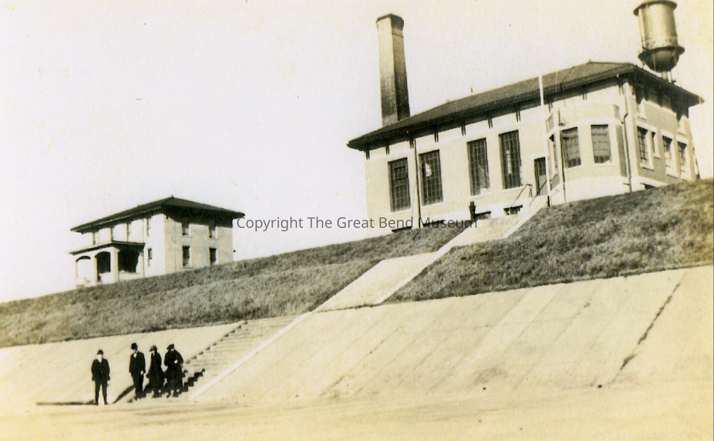 Photo of museum and lock master's house. Four people standing at the bottom of stairs close to the river. Looks like 2 men and 2 ladies all wearing winter coats and hats.Acquisition