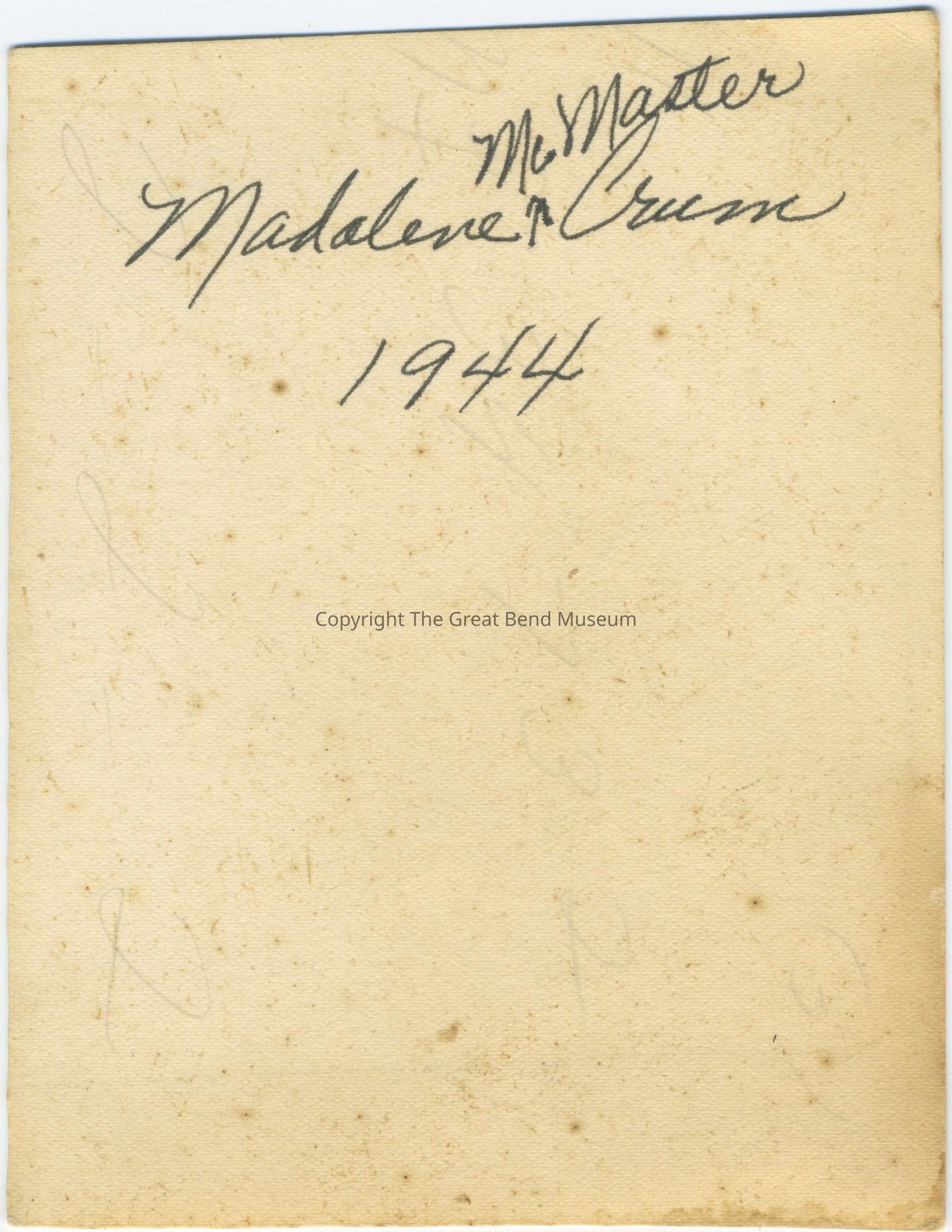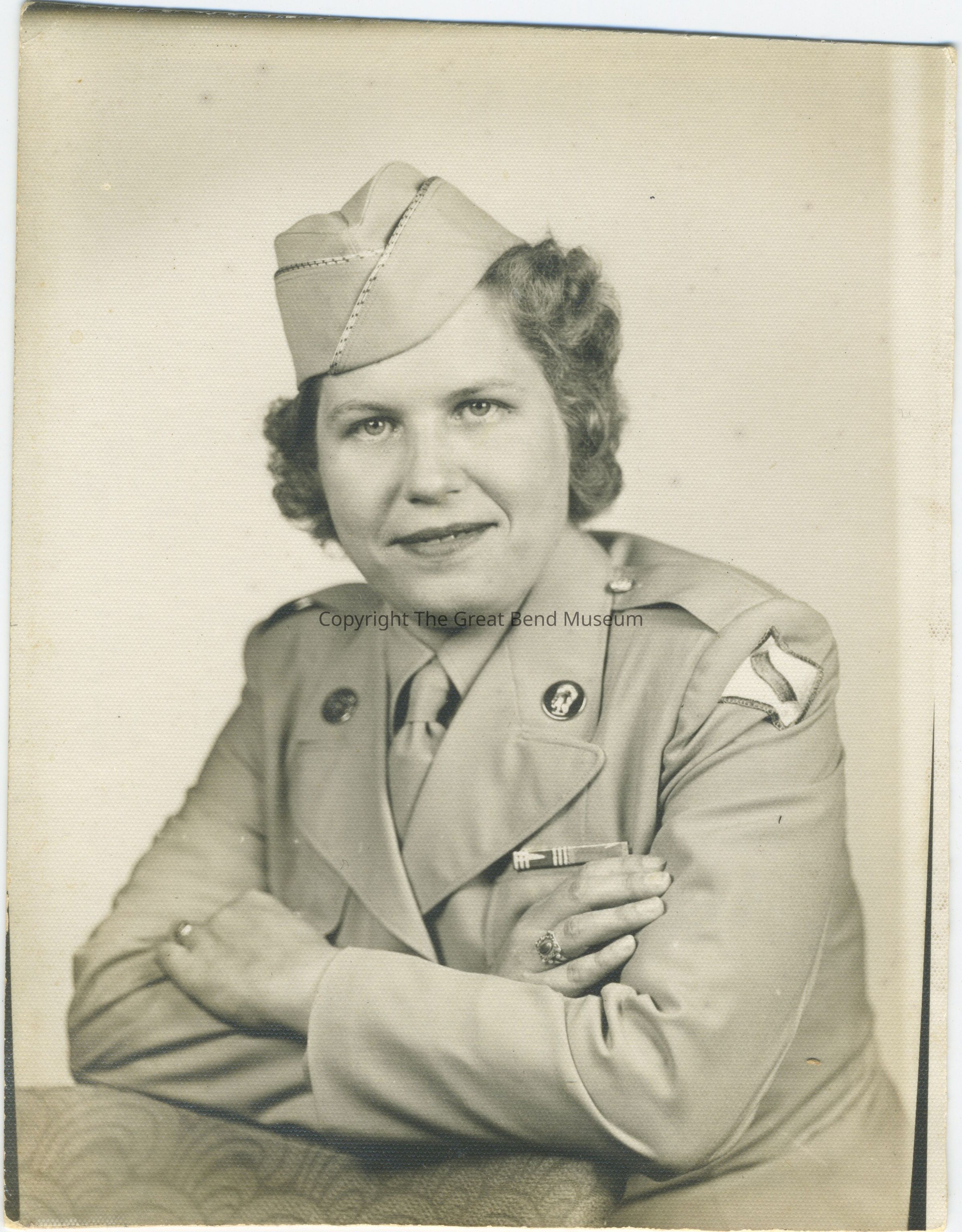 B/W photo of woman in military uniform and portrait, Back "Madalene McMaster Crum 1944" (on back faint pencil "34 - 73 - 2 - 2- 2- 2"0Acquisition