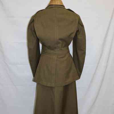 Coat - skirt are darker green with coat having 4 pockets with flaps that button. Blouse is slightly lighter shade of green. with two breast pockets. Hat is a sand color. Sleeve has two flat strips. All buttons have Army insignia.
