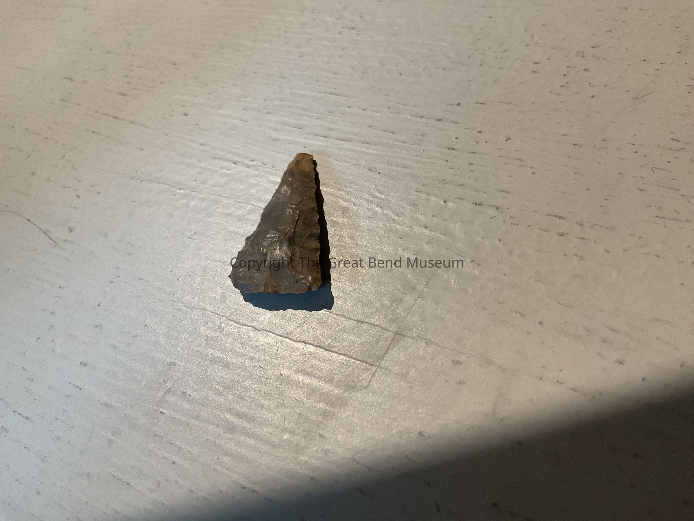 Straight sided isosceles triangle shaped point. Basal edge is straight.Brownish Gray in color. Edges are slightly serrated from resharpening .Acquisition