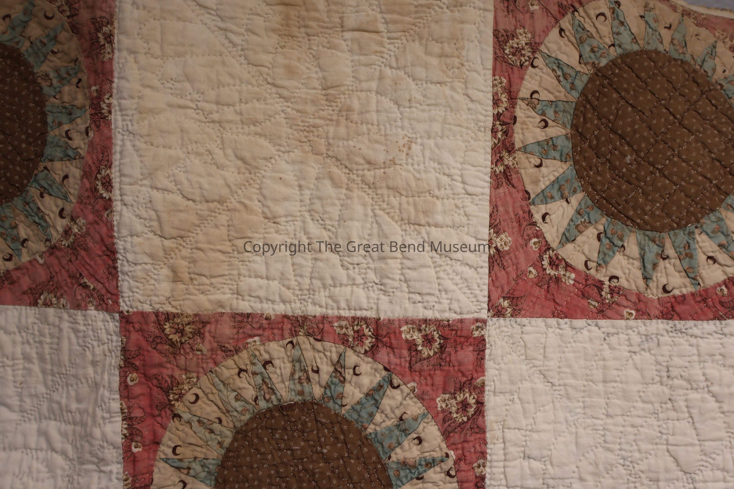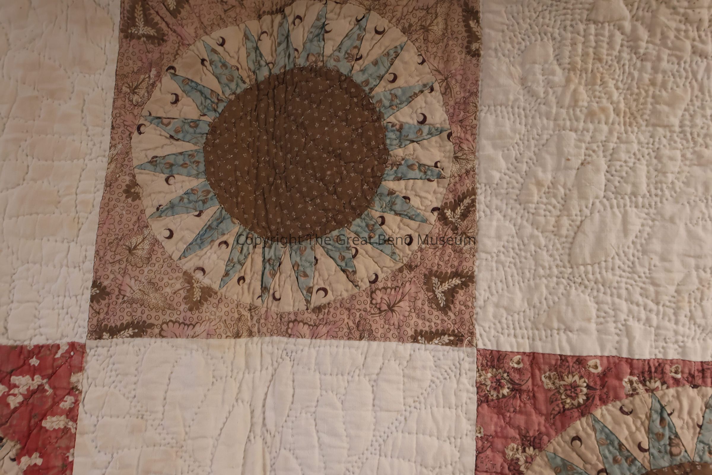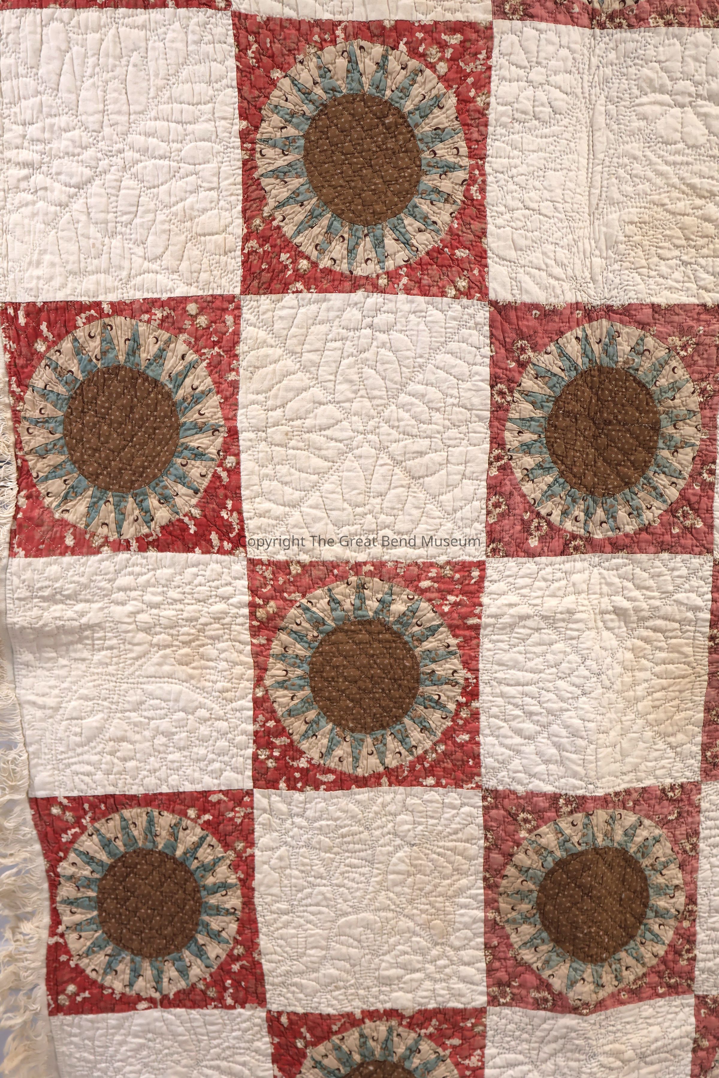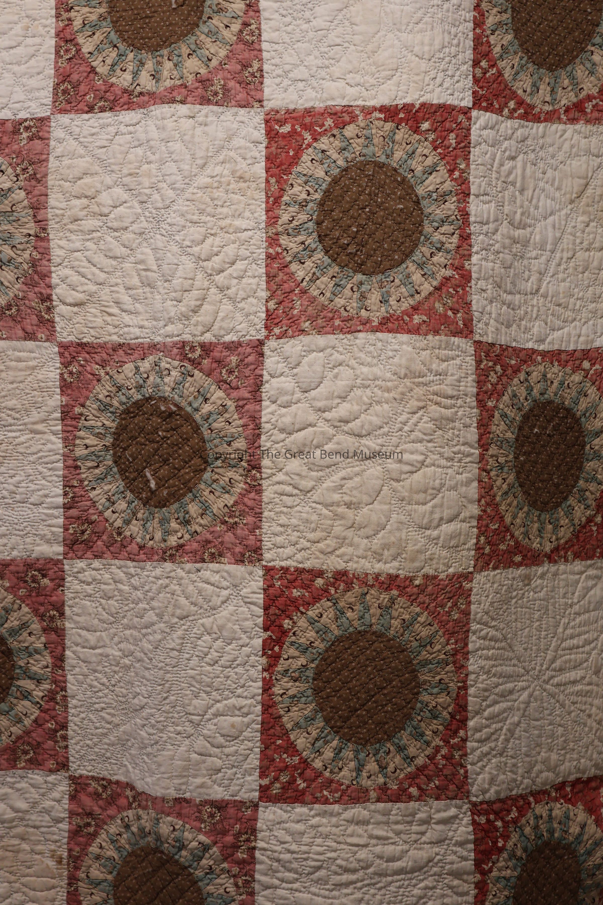 sunburst quilt has " tog 301p"? written on it in pen. Cream solid background with sunburst pattern with pink, green, yellow. A starburst design on red background. Red is a print, and yellow is a print. Quilting is minute and detailed.Acquisition