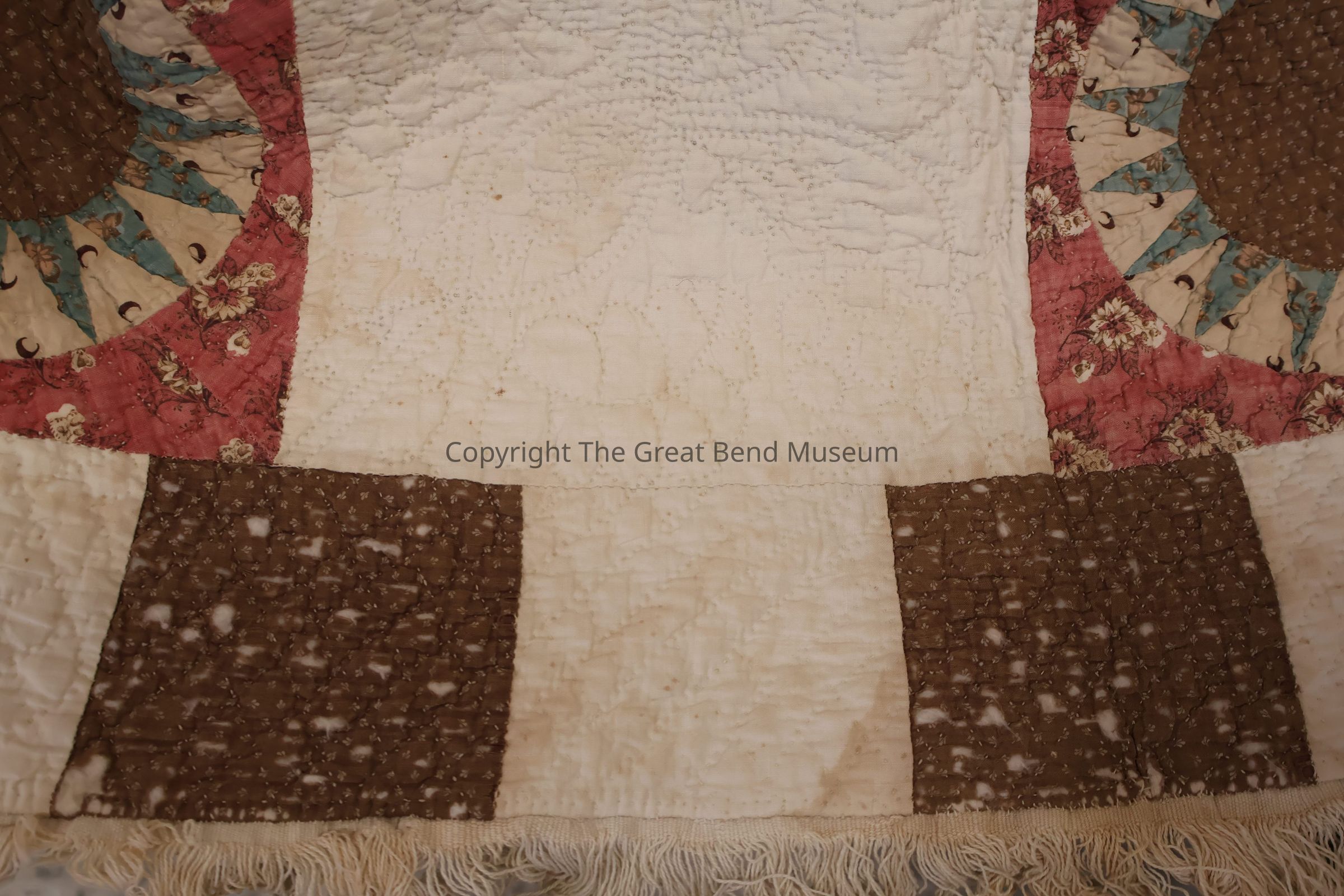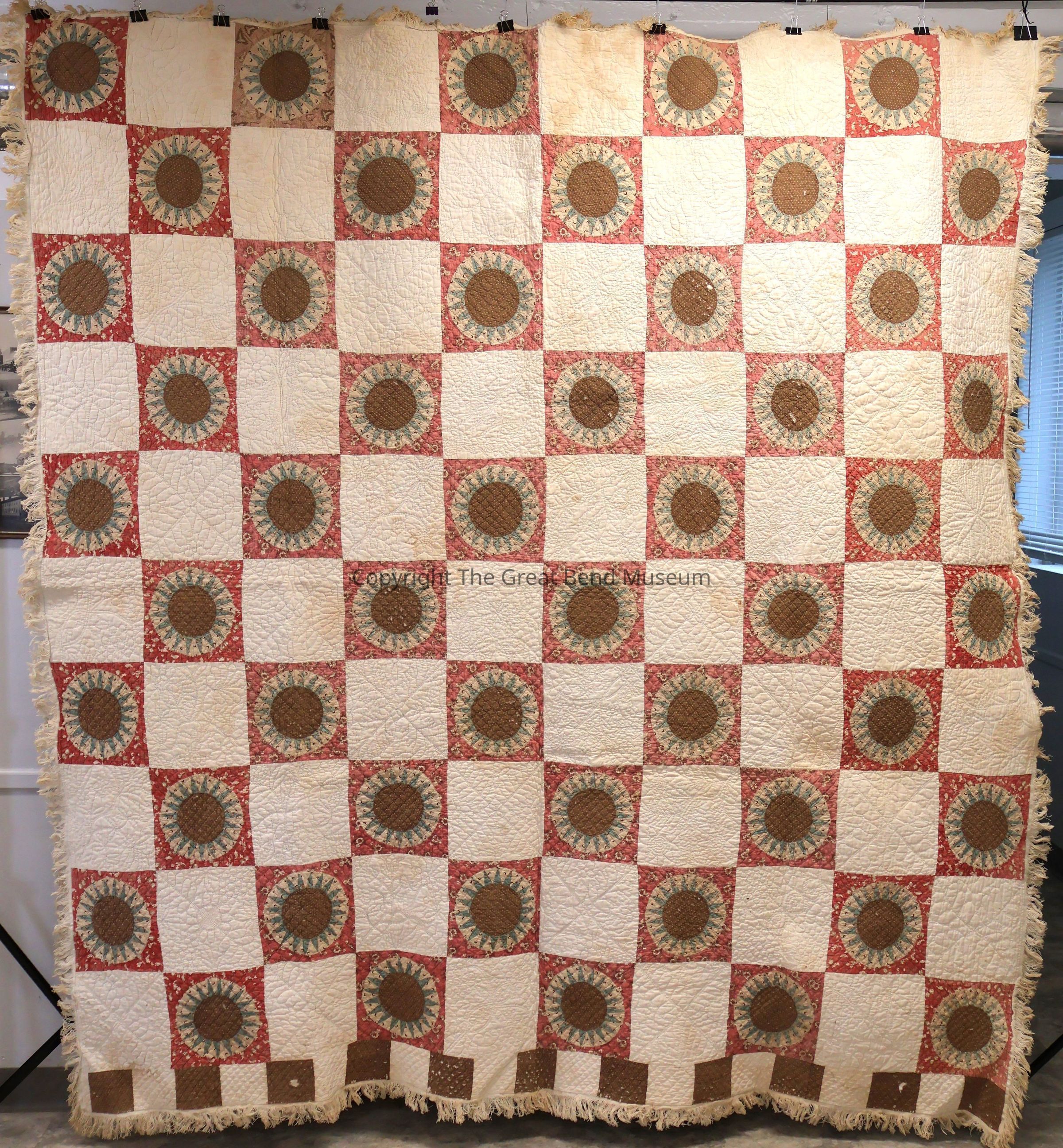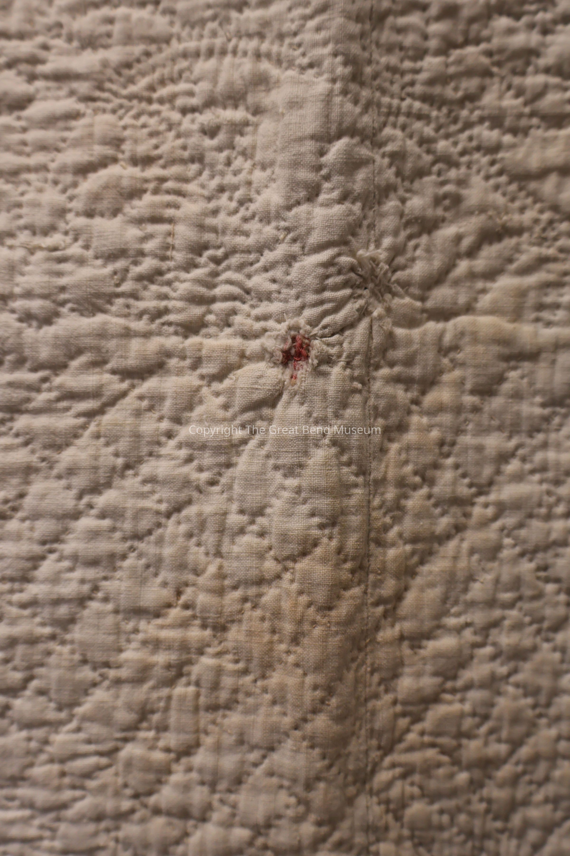 sunburst quilt has " tog 301p"? written on it in pen. Cream solid background with sunburst pattern with pink, green, yellow. A starburst design on red background. Red is a print, and yellow is a print. Quilting is minute and detailed.Acquisition