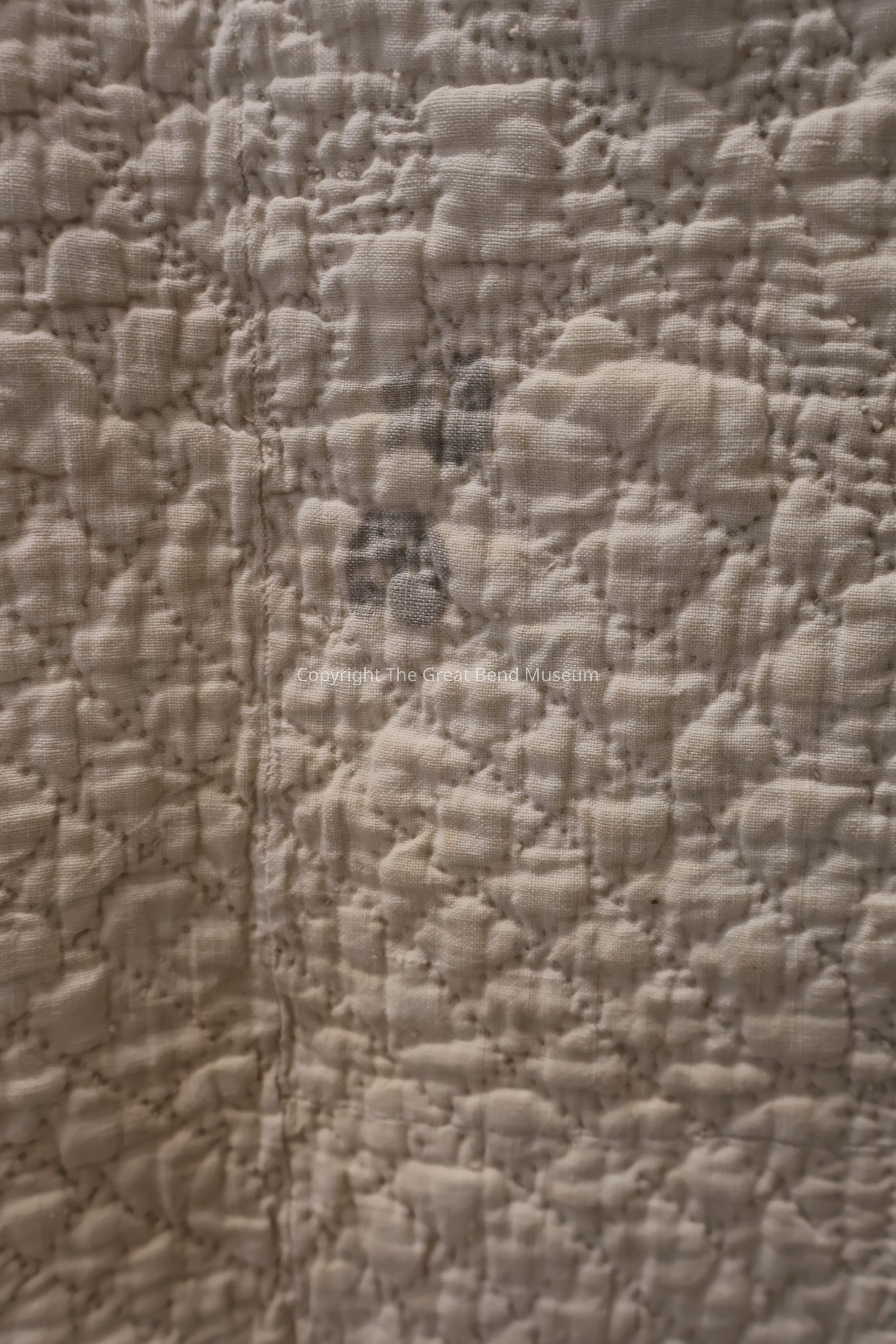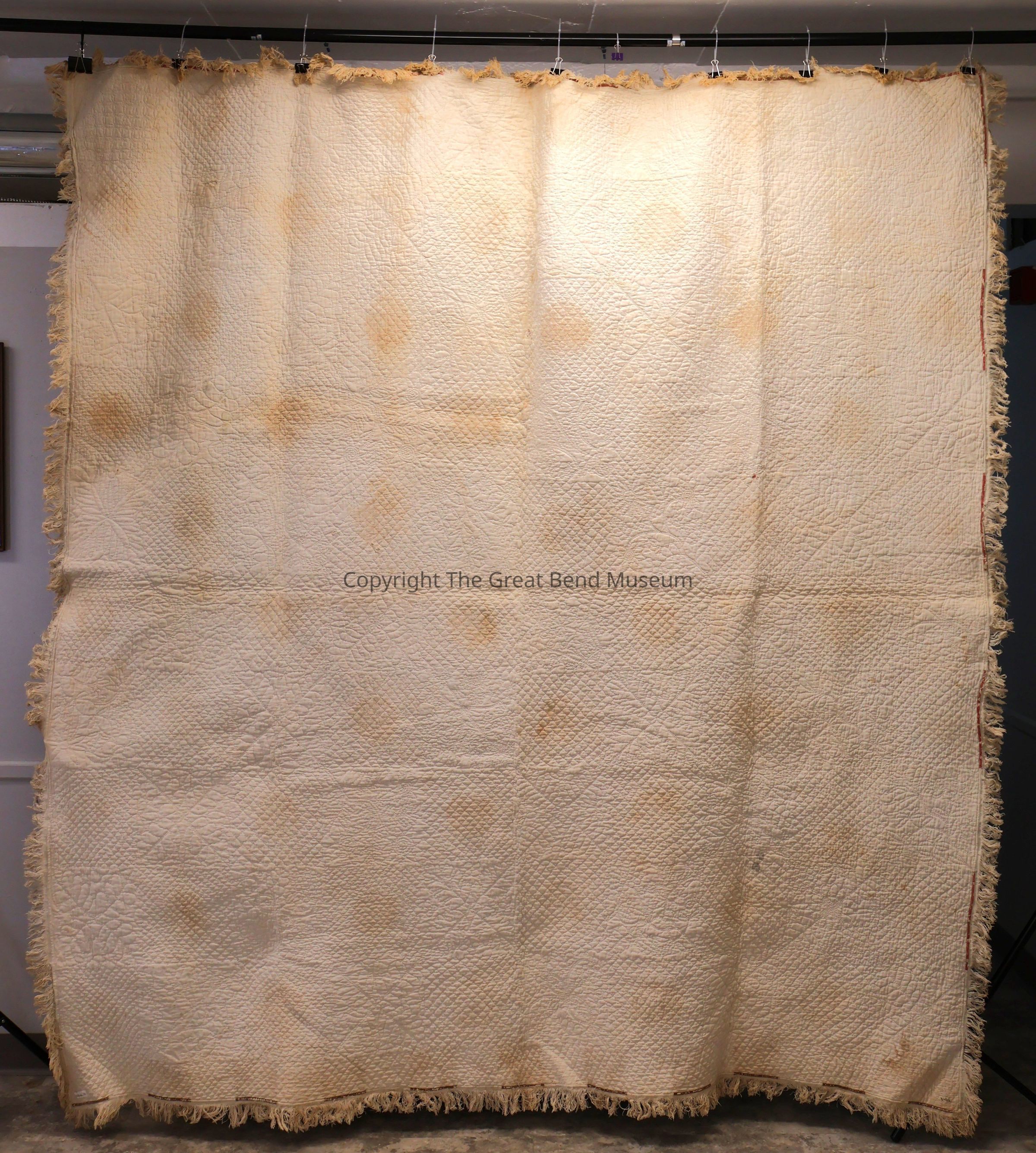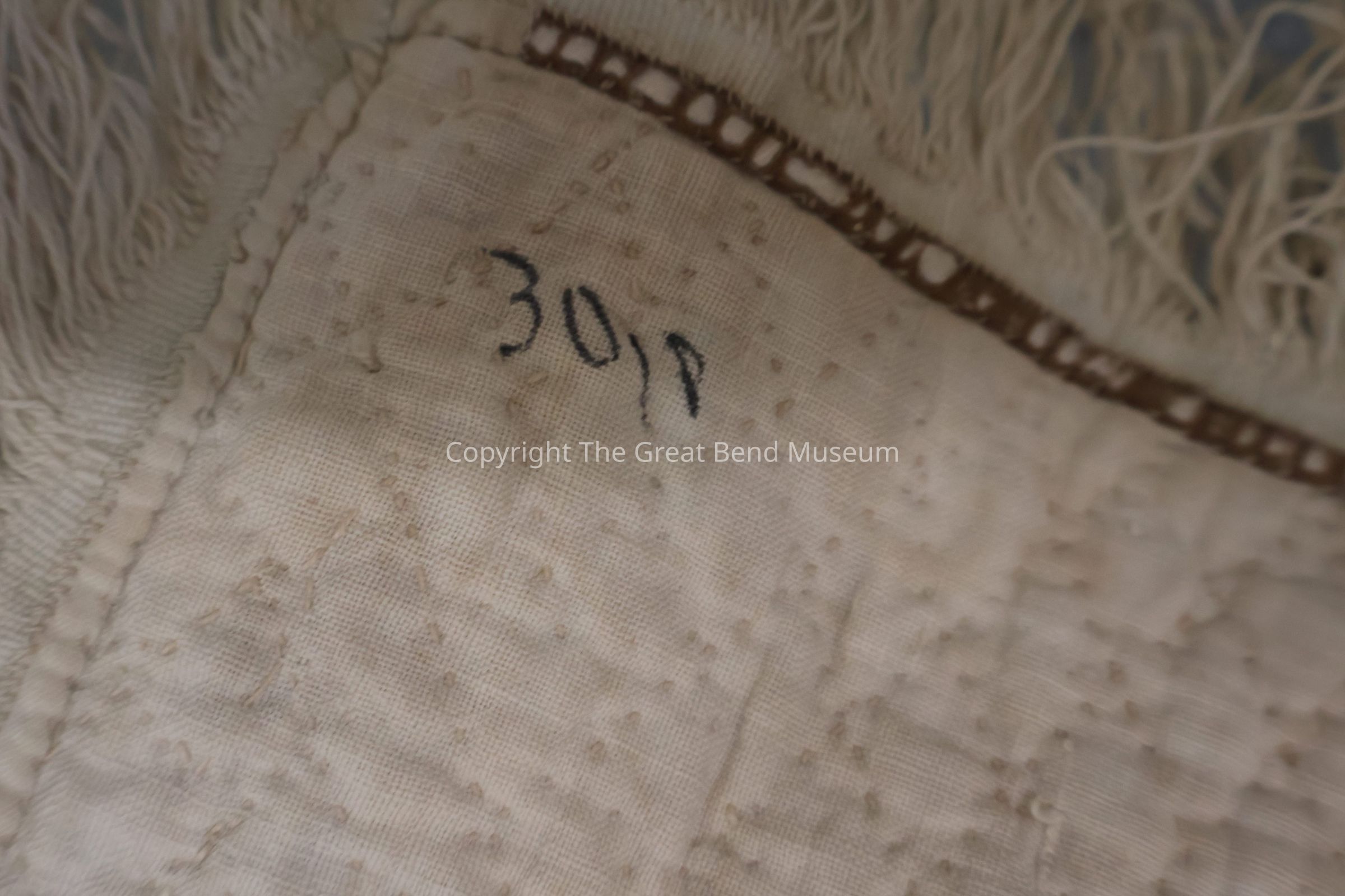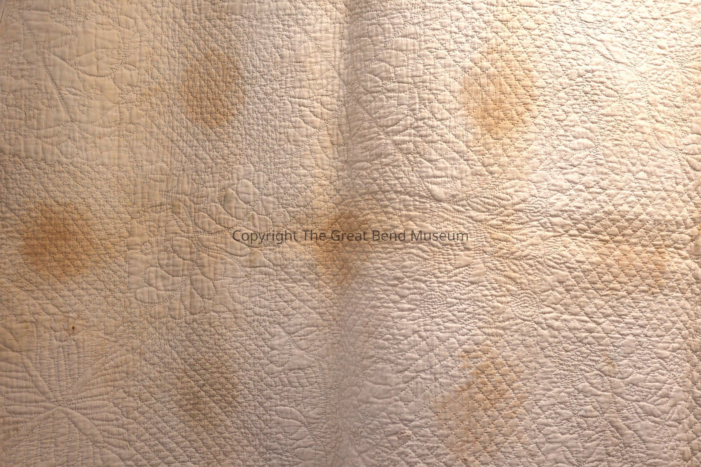 sunburst quilt has " tog 301p"? written on it in pen. Cream solid background with sunburst pattern with pink, green, yellow. A starburst design on red background. Red is a print, and yellow is a print. Quilting is minute and detailed.Acquisition