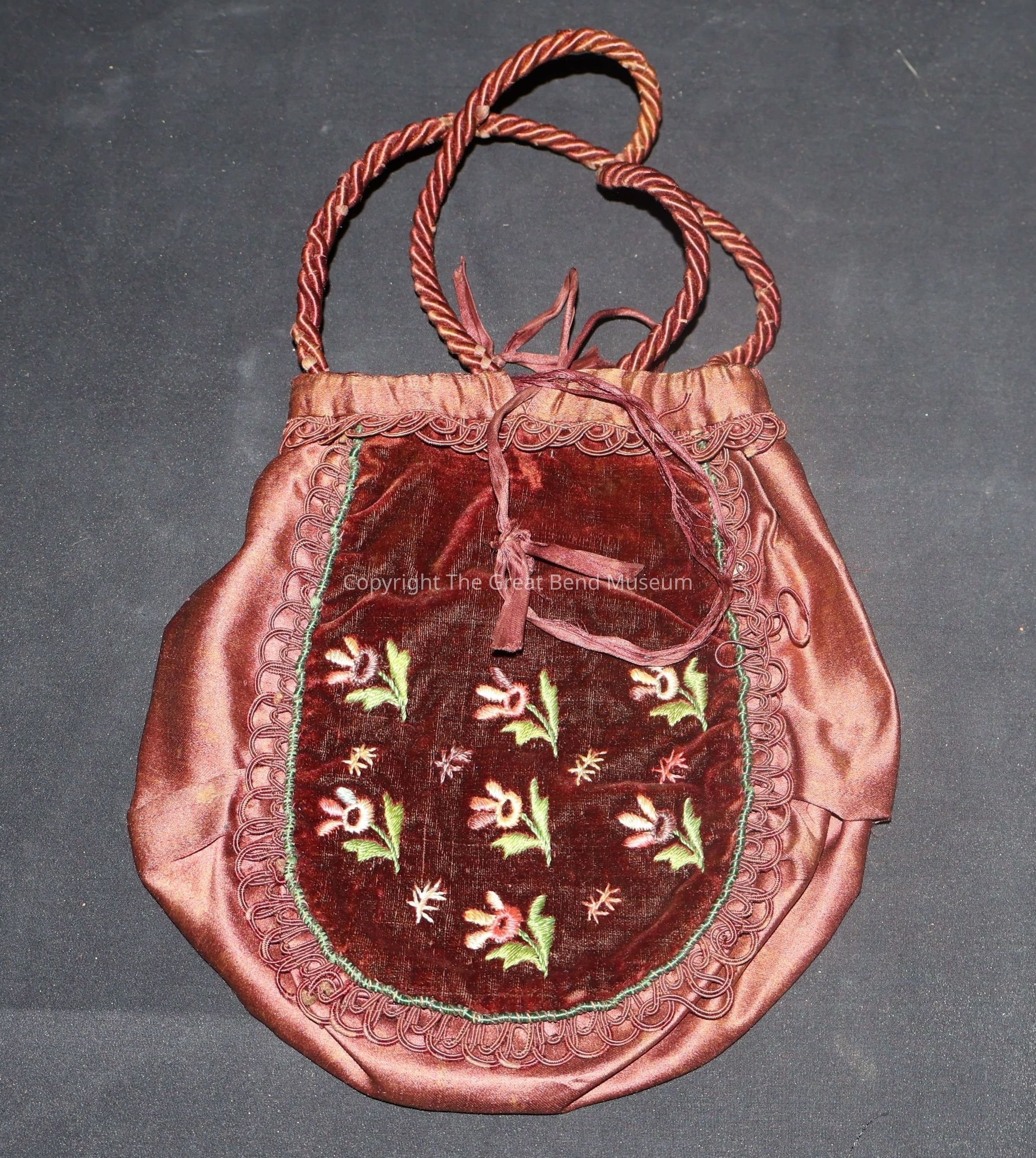 Maroon pouch style purse with embroidered flowers. Silk and velvet. Rope cording handles with drawstring closure. Loop cord trim around embroidery. Faded, frayed ribbon drawstring, staining and discolored inside. No labels or tags. Tear along seam where velvet meets silk.Acquisition