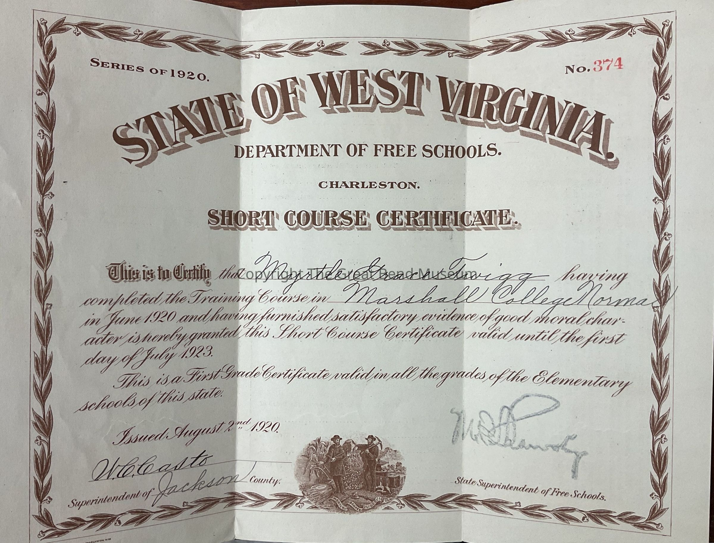 Myrtle Grace Twiggs’ short course certificate from Marshall CollegeAcquisition