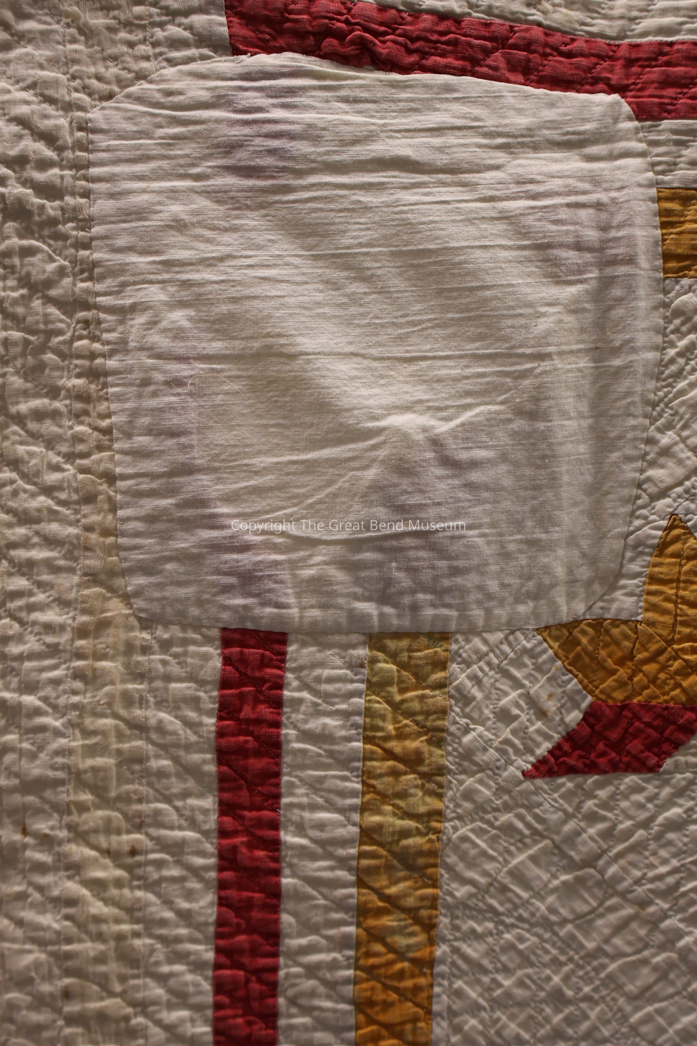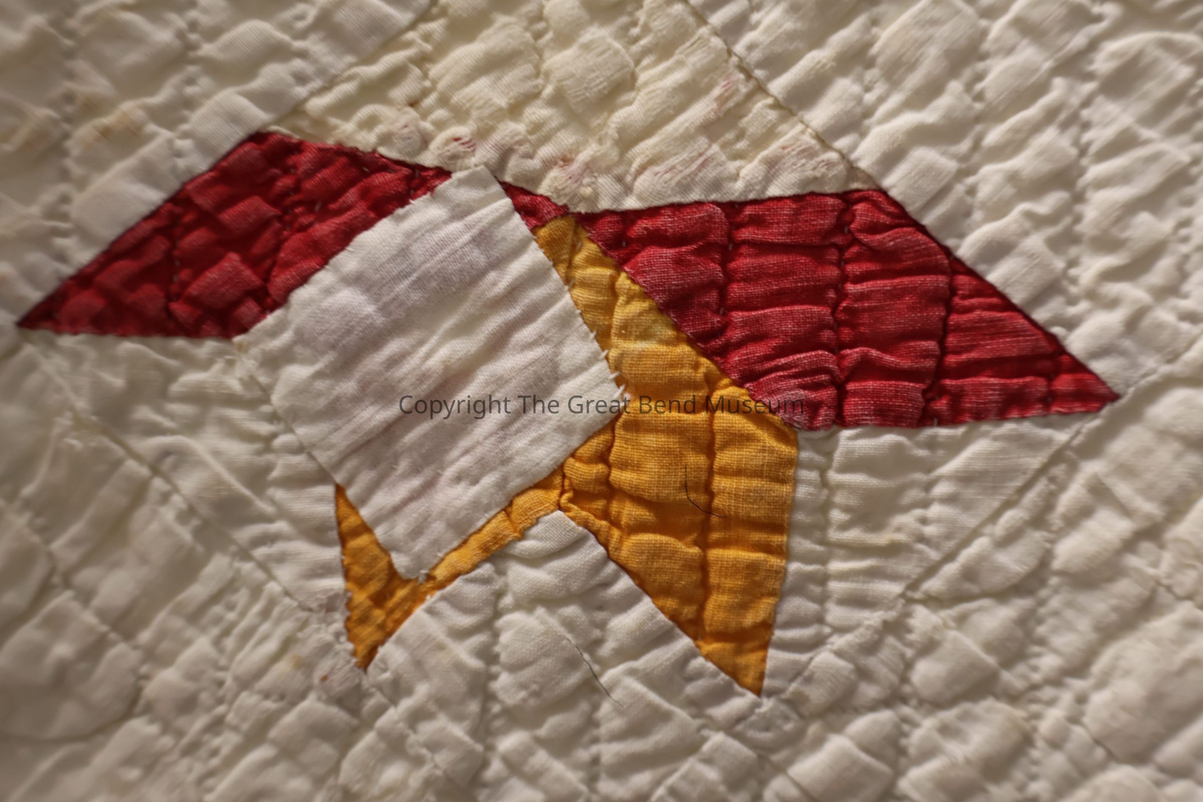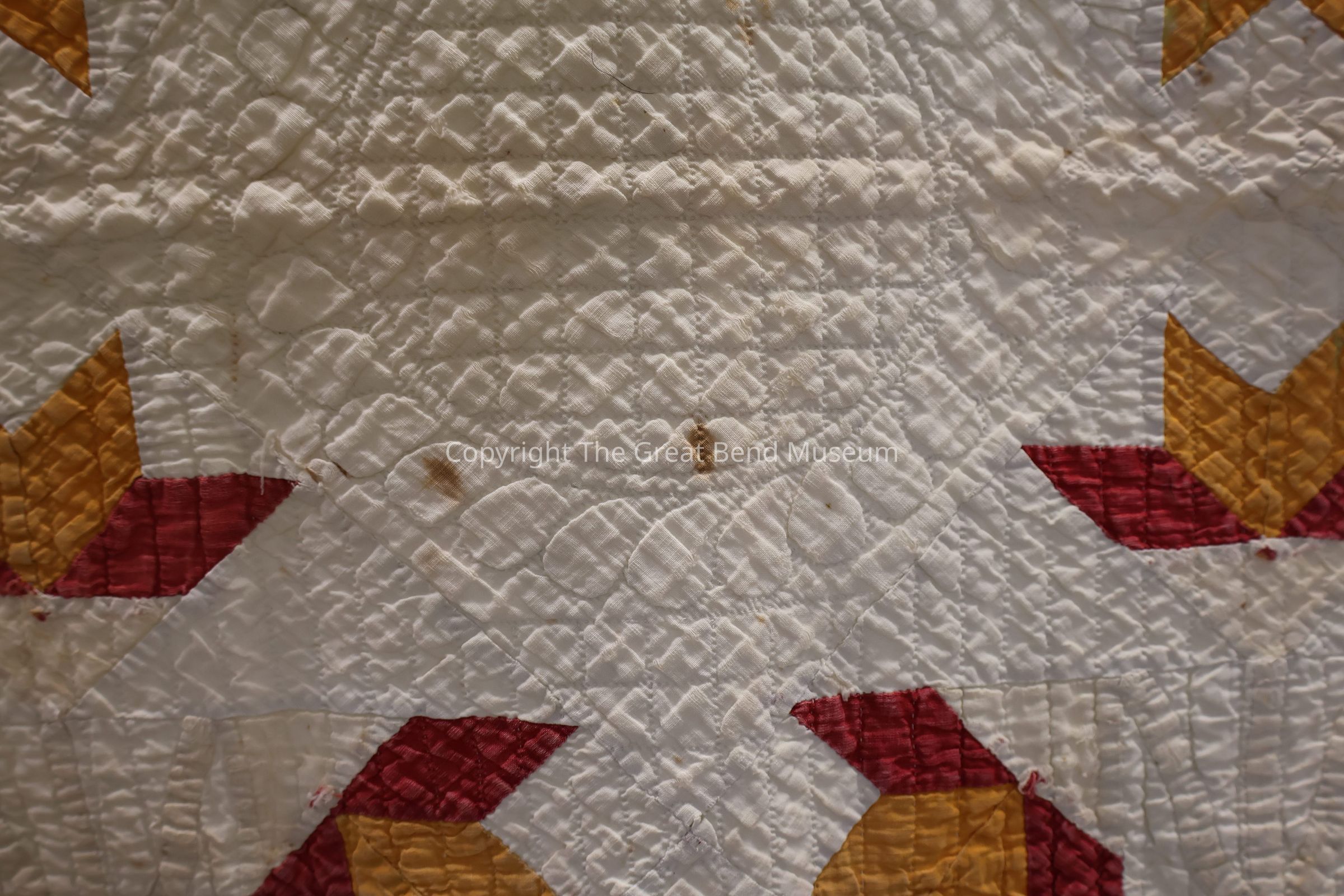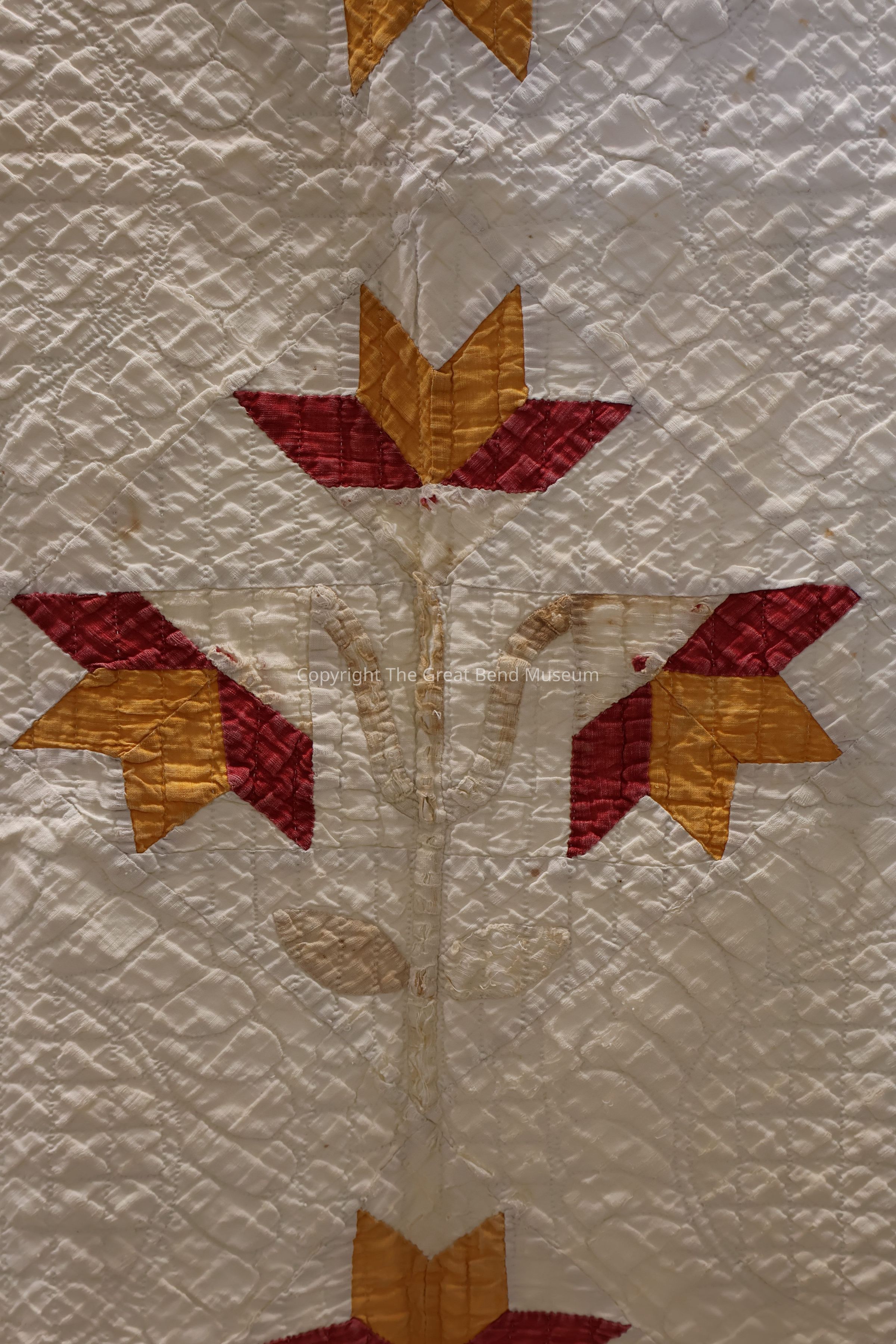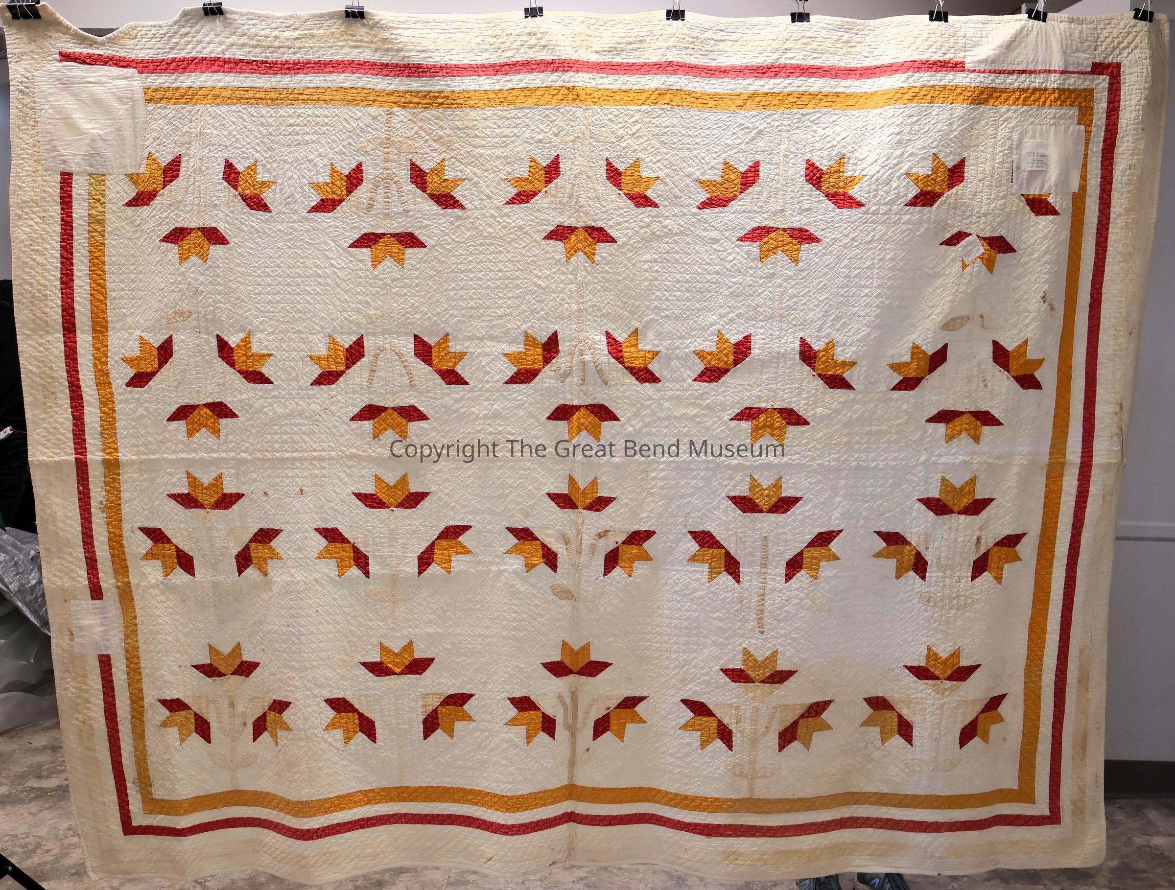 Gold, red on white background, tulip patterned quilt. Has light yellow, gold, red stripes for border.Acquisition