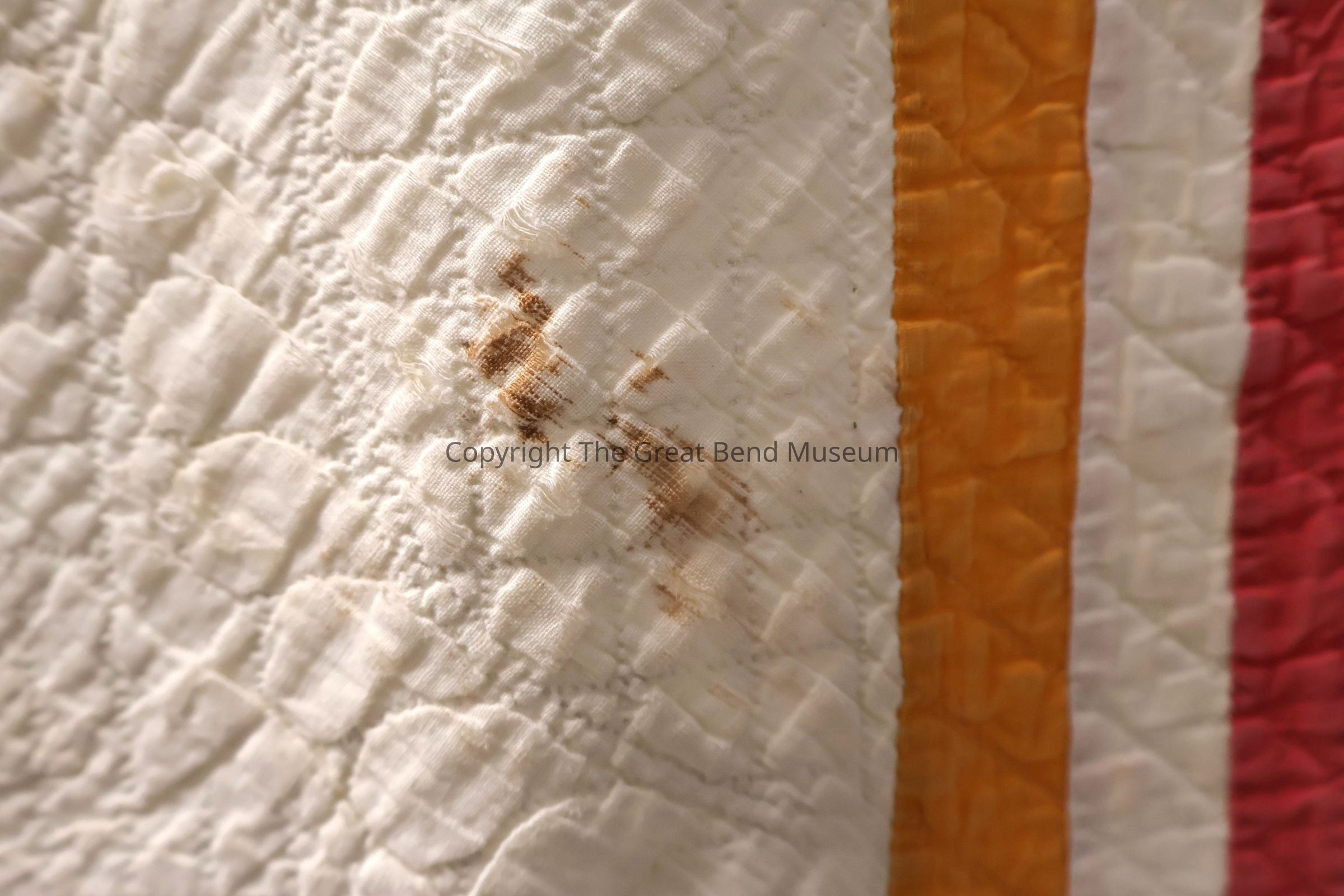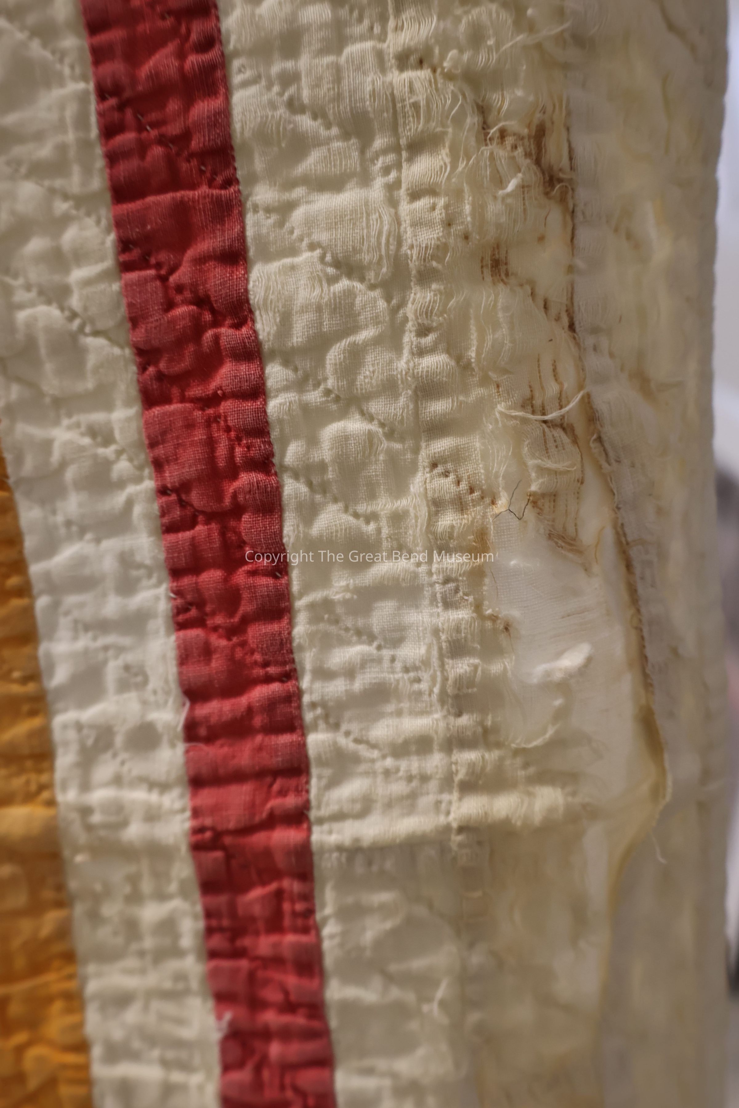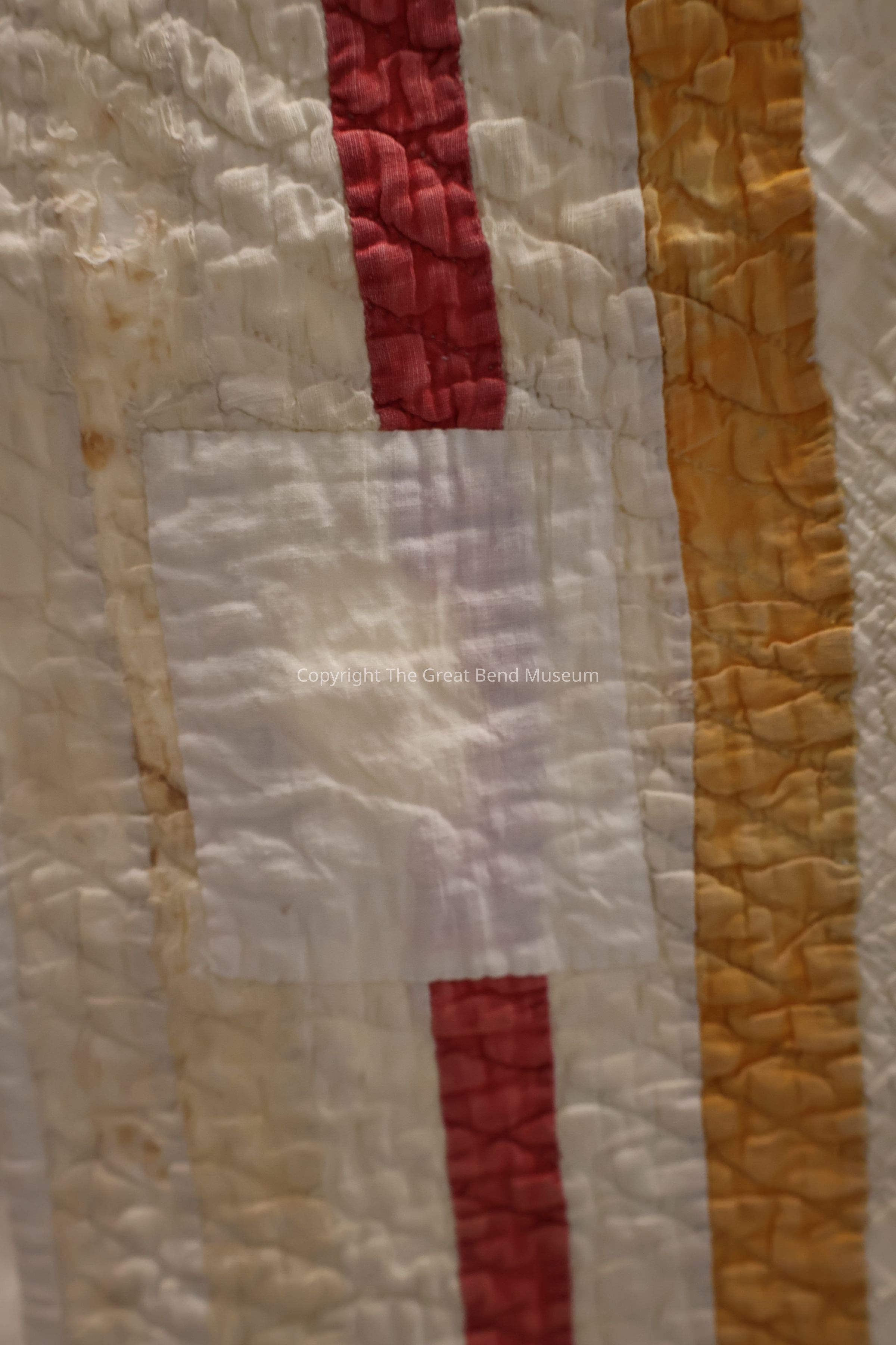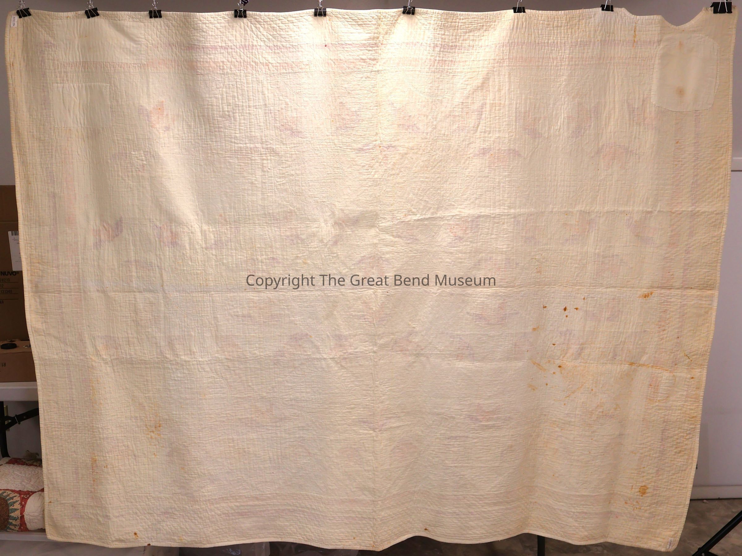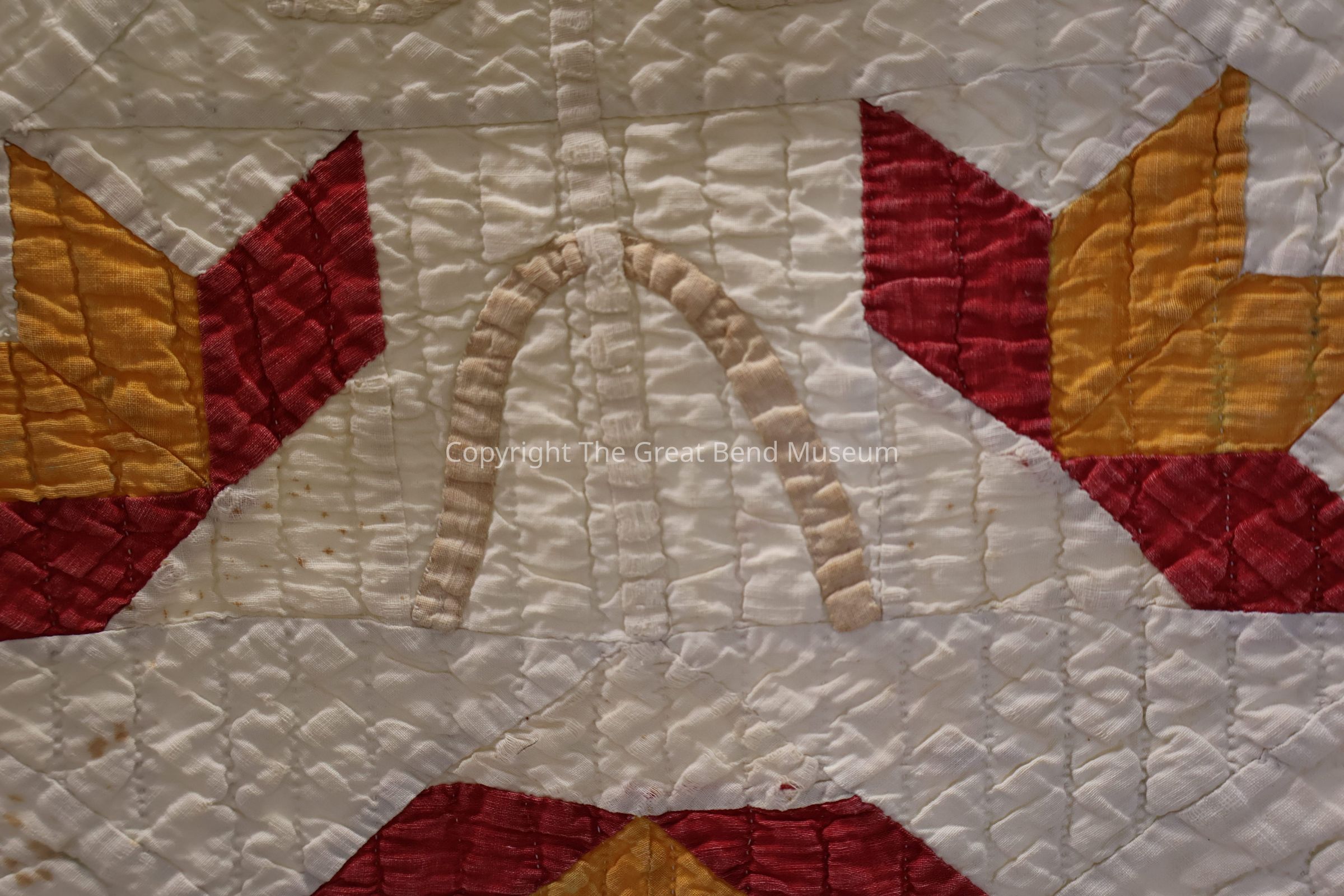 Gold, red on white background, tulip patterned quilt. Has light yellow, gold, red stripes for border.Acquisition