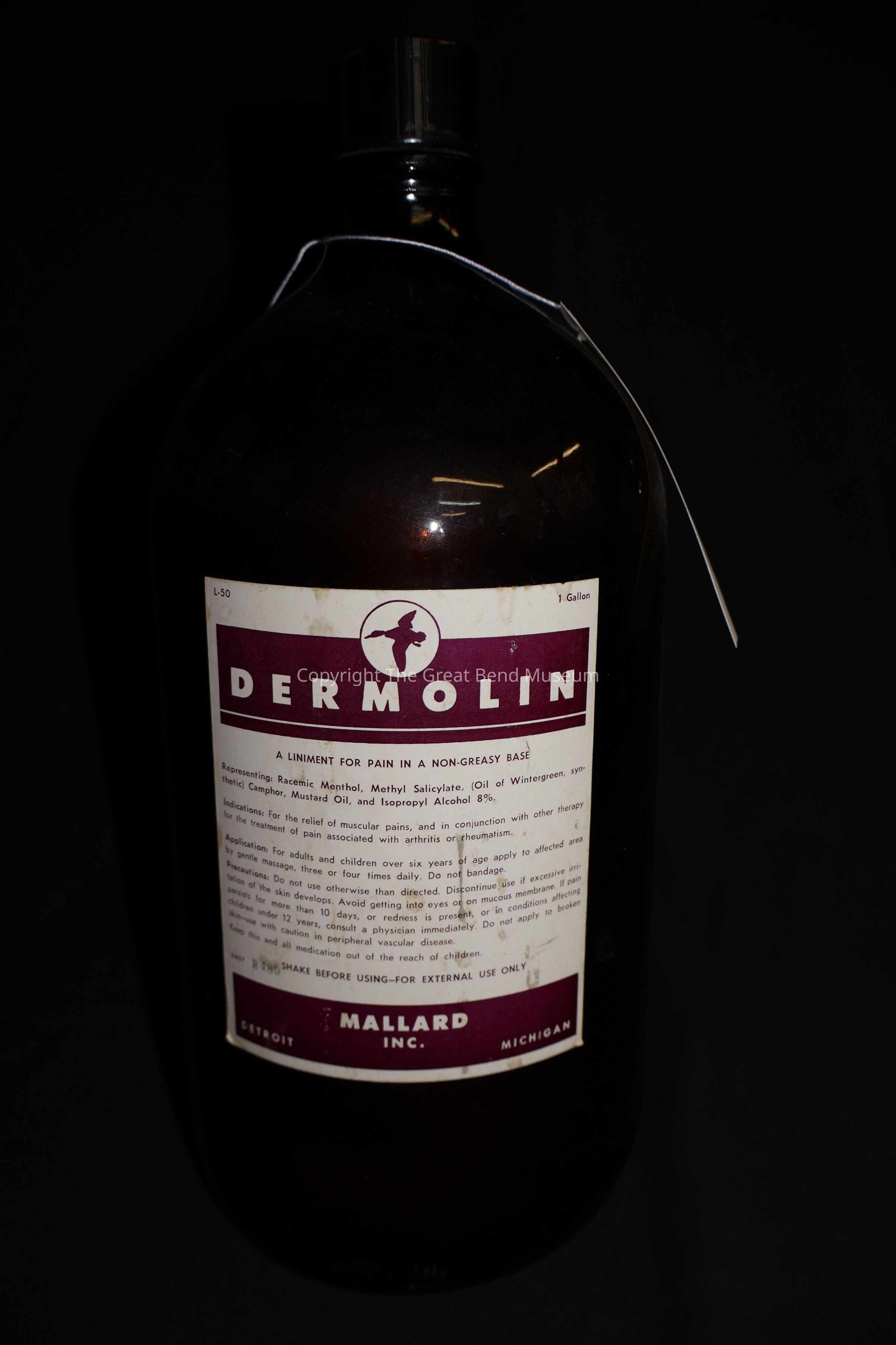 Large brown (amber) medicine bottle - says Dermolin -- which is a linament for muscle pain (arthritis) used by adults and children over 6 - label is cream colored with burgundy strips. Mallard In is maker - has a picture of Mallard (Duck) at top of label. Bottle is a cylinder with a black plastic screw on lid. Embossed with 7 1 7 on bottom. Also has Douglas embossed on the plate of the bottom.