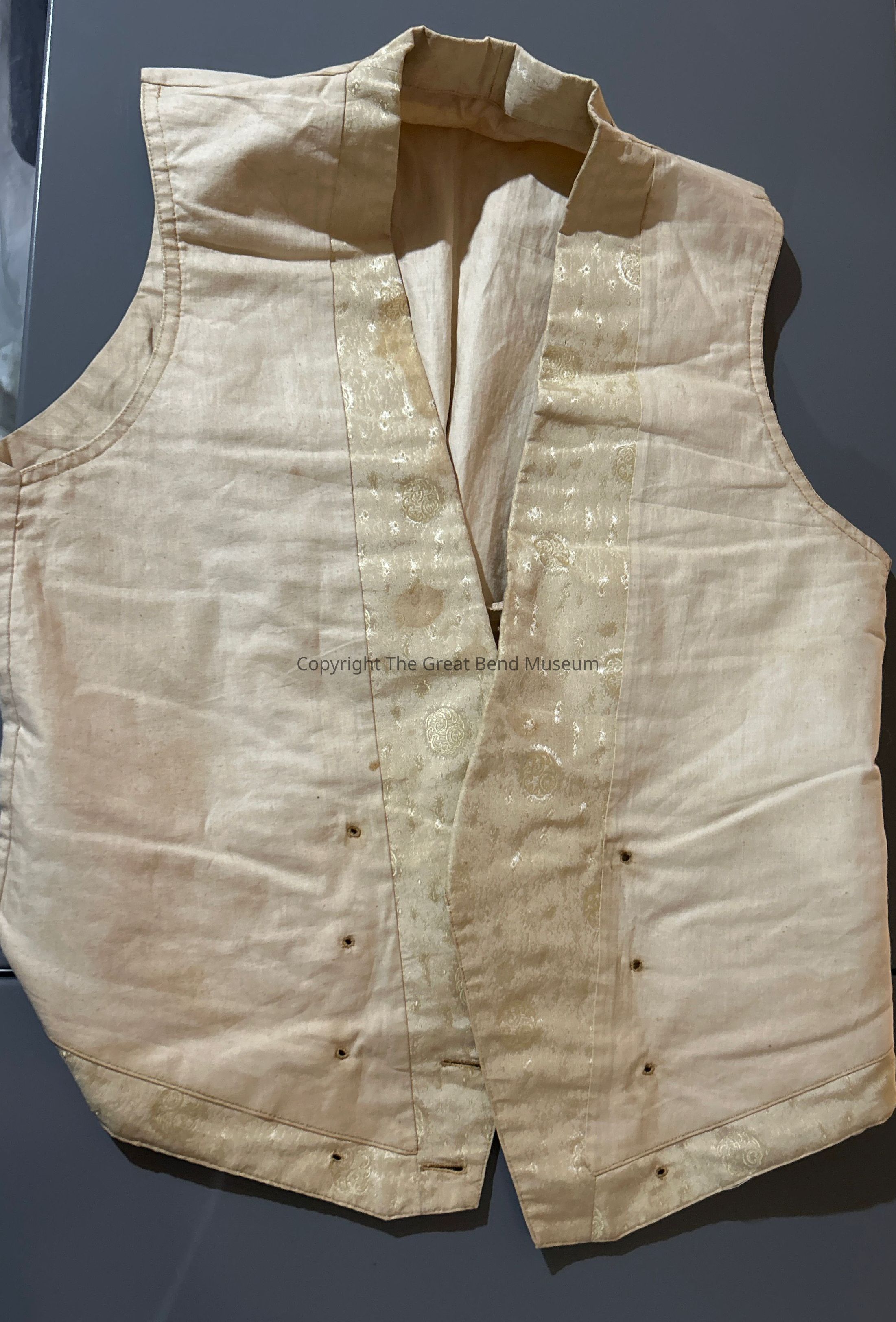 Cream colored with gold embroidery throughout, corset style backing. Three pockets in the front. Three button loops, six missing buttons.Acquisition
