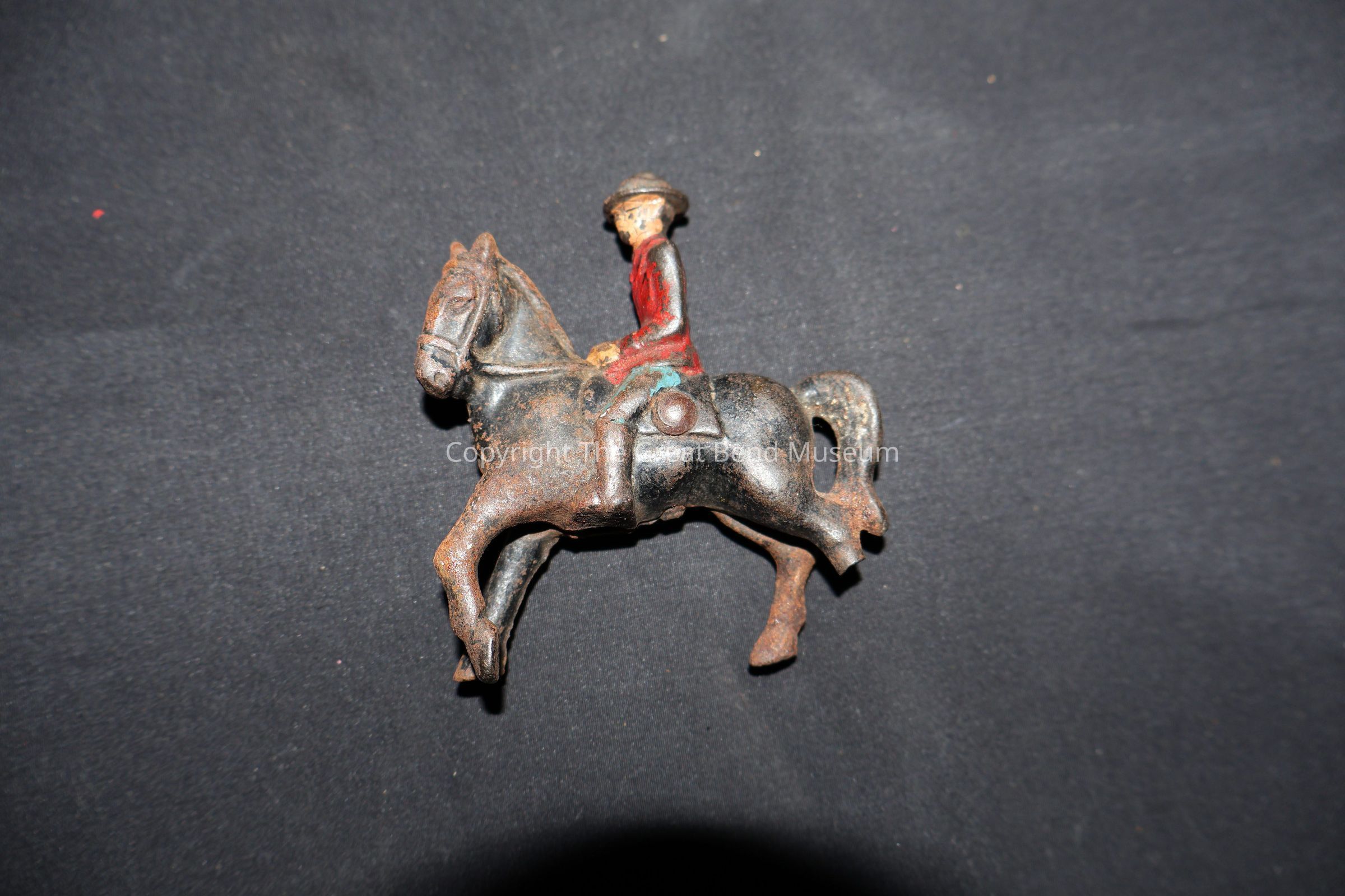 metal horse with cowboy - horse missing hind leg. Cowboy has on hat, red shirt or jacket, some green on pants on left leg, wearing boots. right side has more rust. Saddle may have canteen on right side seam down middle.Acquisition