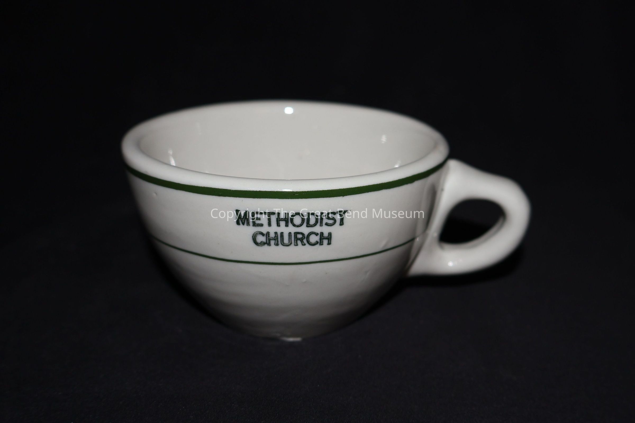 It is a round, squat teacup with matching saucer. There are two lines of green glaze around the cup and one on the handle. There are three around the saucer. There is "Methodist Church" stamped on the front of the cup. And "Trenle Blake China Co.,Ravenswood, WV" on the bottom with "RAVEN&LOG."- later designAcquisition
