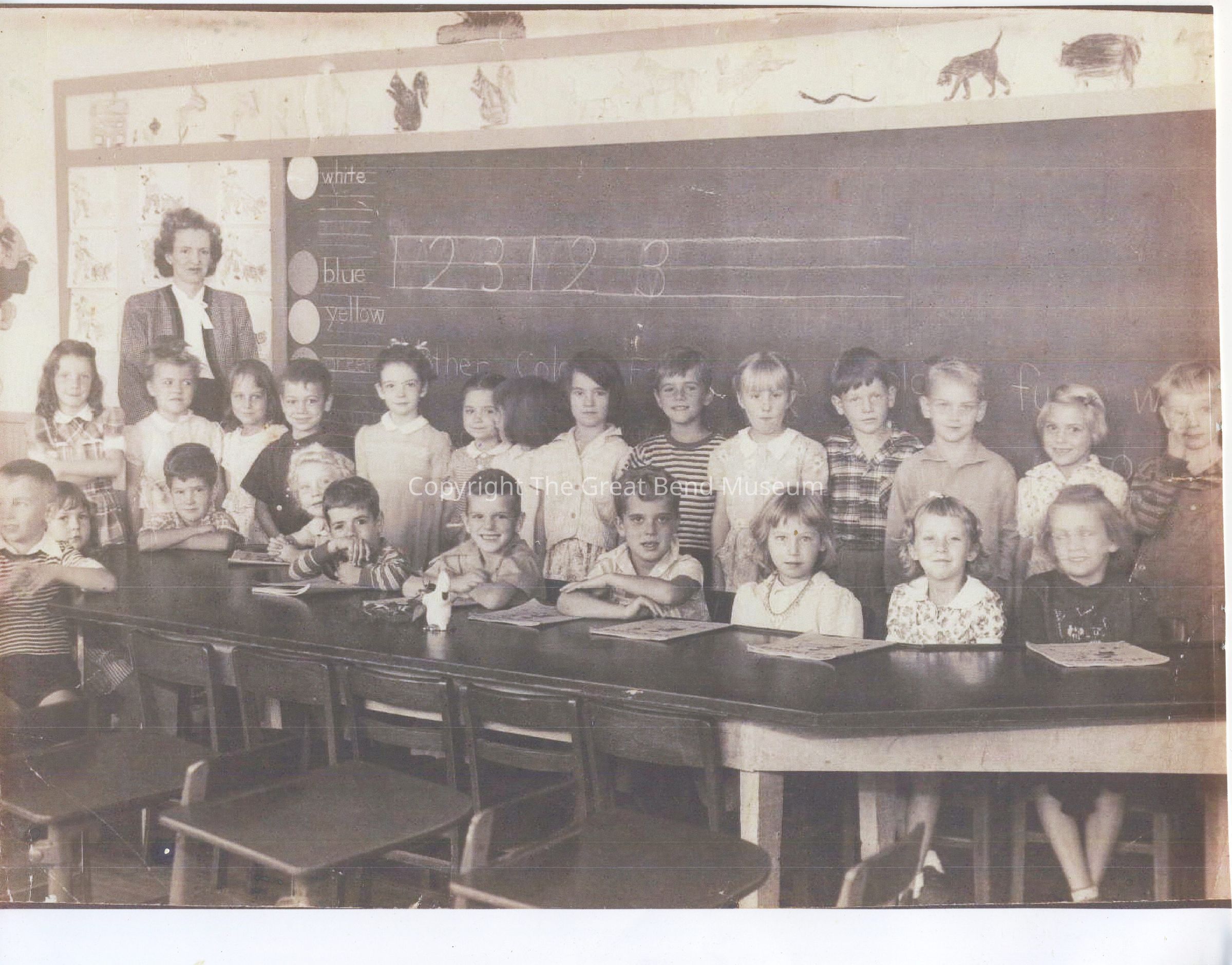 Black and White picture of 24 1st grade children (class of '59) and teacher, Miss Lilian May Dye. There is a blackboard at back that has colors and numbers. The student's artwork is on the wall to left with animal drawings above them. Front row seated at the table left to right: Jim Noll, Nina Harmon, Joe Lee McCoy, Mary Reno, Charles Heater, Clement Matheny, Curtis Fletcher, unknown girl, unknown, girl, June 'Sis' Suck. Students standing in back left to right: Diane Chambers, Unknown girl, Pat Abels (Kelly), Steve Seaman, Becky Fox, Sue Sommerville, Jo Slaven (head turned), unknown girl, William Pease, Helen Foggins, Bill Bever, unknown boy, unknown girl, unknown boy.Acquisition
