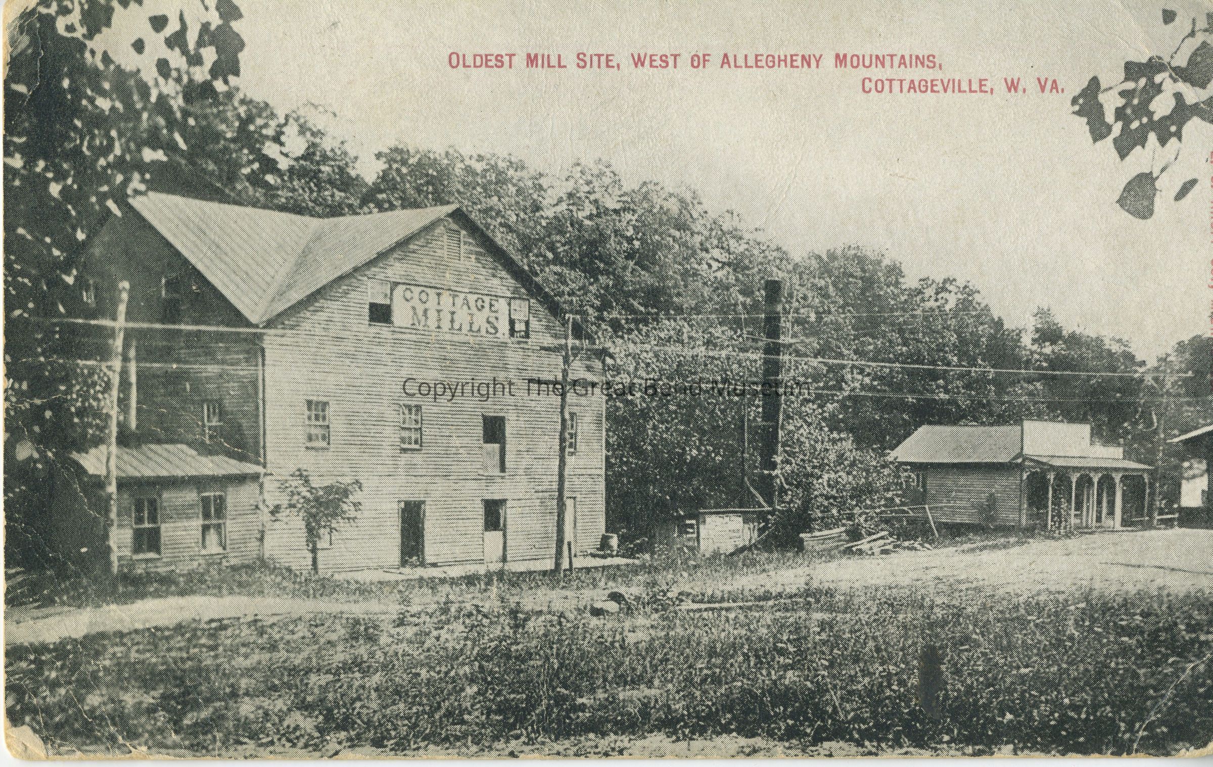 The image is of buildings, large "Cottage Mills" sign on main one in the center left. Another, possibly stable, at edge of frame center right. Phone lines run between buildings and the viewer. The title is typed in red at the top, printed along right edge. On the back: "At one time Moore's Mill - in the early 1800s. Virginia Gorby." Label: "the cottage mill was built by Daniel Deming Rhodes in 1858 and the dam in mill creek also. the wooden bridge was built by a man named Evans. i believe it is conceded that it is the oldest mill site west of the Allegheny mountains. this old mill was destroyed by fire august 4, 1965."Acquisition