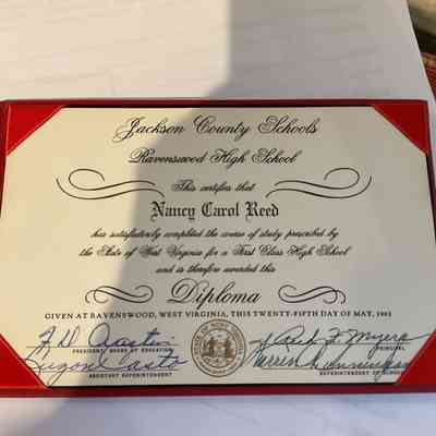 Small leather bound copy of Ravenswood High School Diploma of Nancy Carol Reed. May 1962 Booklet is dark Red , signed by F.D. Austin, Cuzon Casto, Reed F. Myers and Warren Cunningham.Acquisition