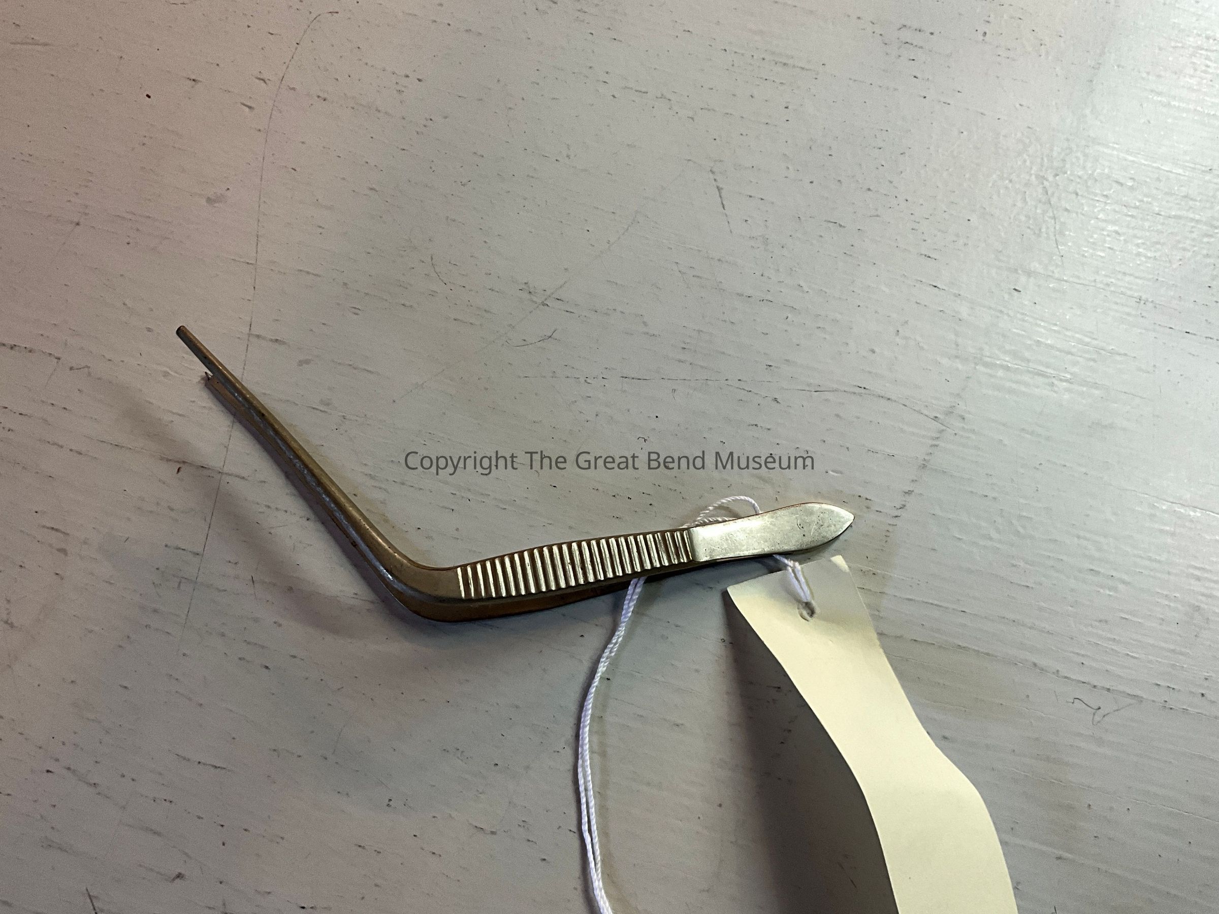 Tweezer like instrument, with angled bend in middle to retrieve bandages from the nasal cavity. Metal is grooved in center of blades for better grip. Both blades come to a sharp point. Has pat number embossed on inside of left blade.Acquisition