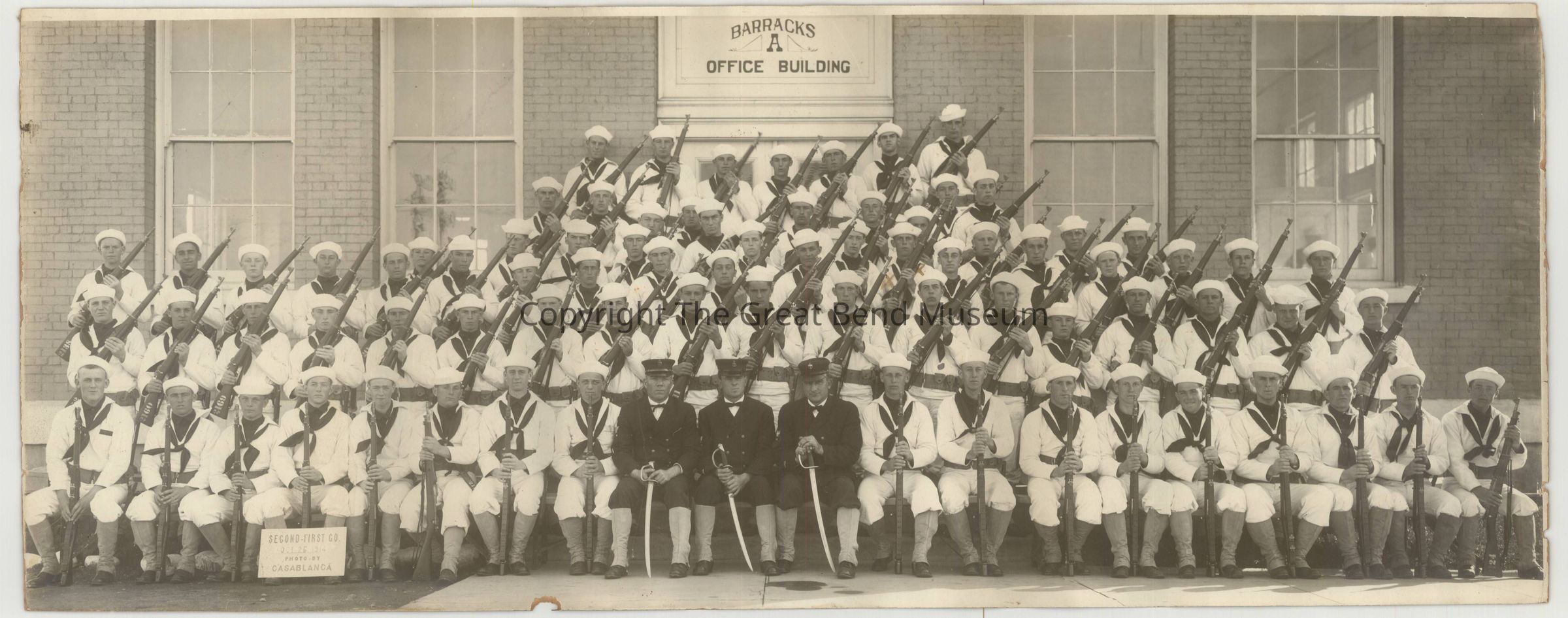 group picture of sailors in front of the Barracks A Office Building Second - First Co. Sailors are in white uniforms w/ hats, each is holding a gun. There are 3 officers on front row in the middle, each holding a sword, there are in black uniforms and hats.