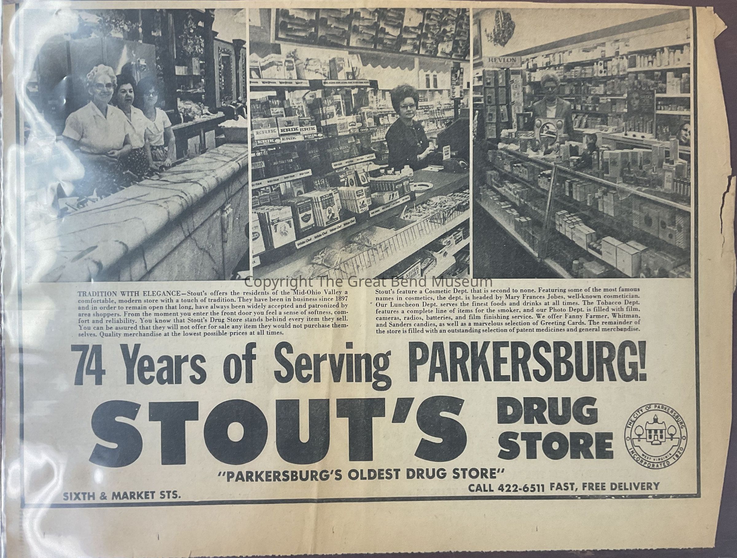 “74 Years of Serving Parkersburg! Stout’s Drug Store”