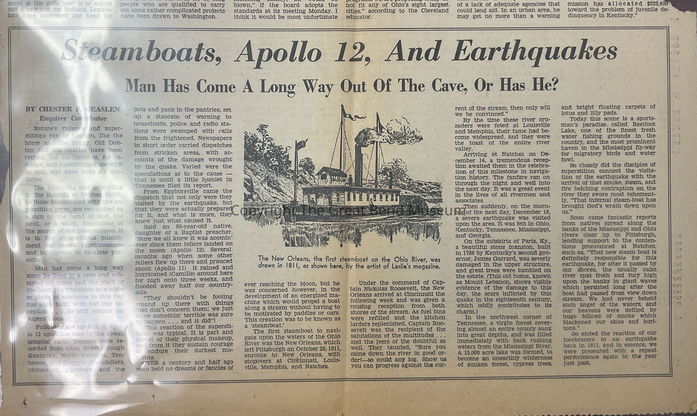 “Steamboats, Apollo 12, and Earthquakes. Man Has Come A Long Way Out Of The Cave, Or Has He?”Description