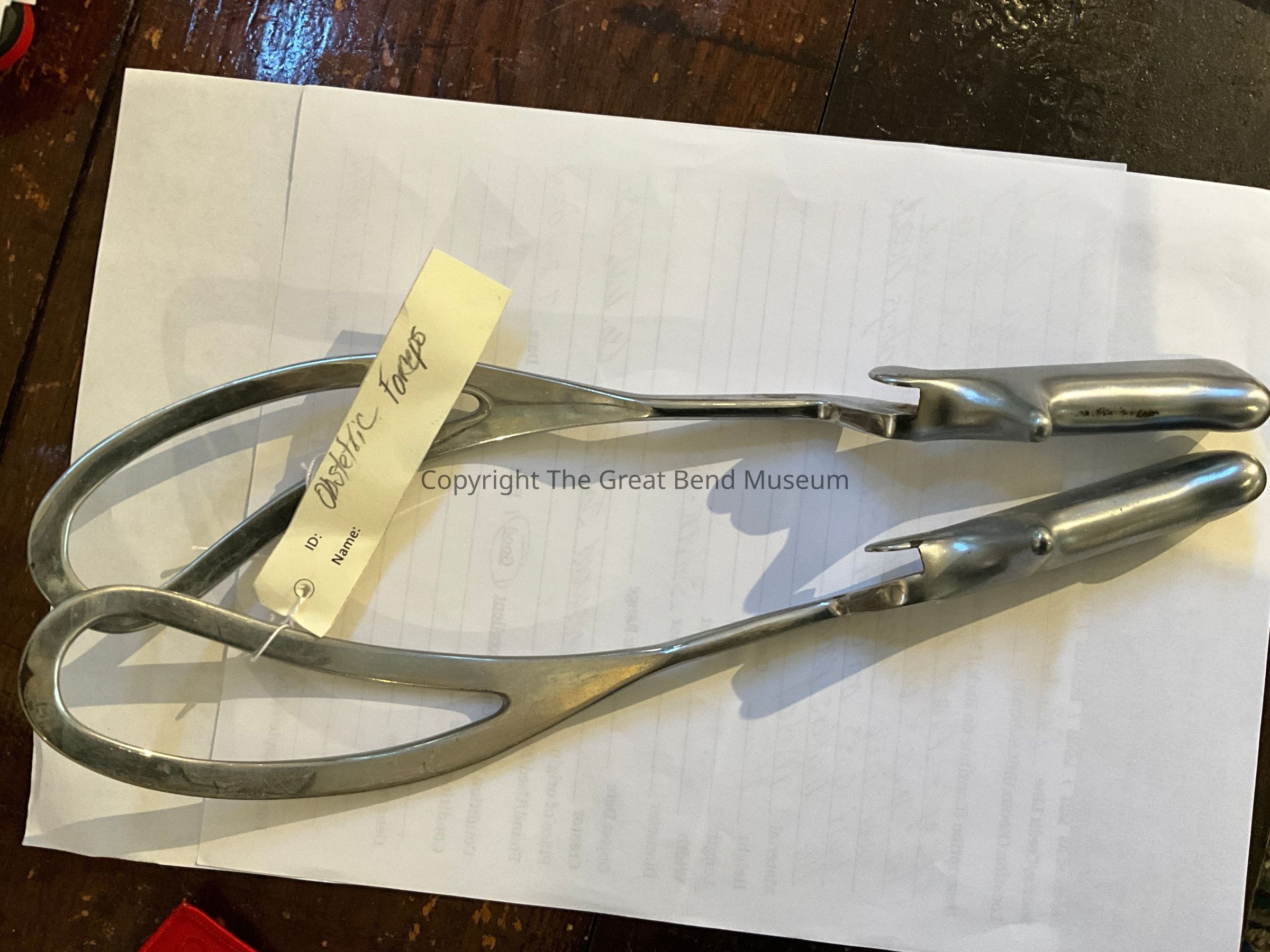 Stainless Steel obstetric birthing forceps. Curved handle to fit grip with long loop. Looks like oversized salad tongs. Each curved half goes on either side of baby’s head. No makers mark on item.Acquisition