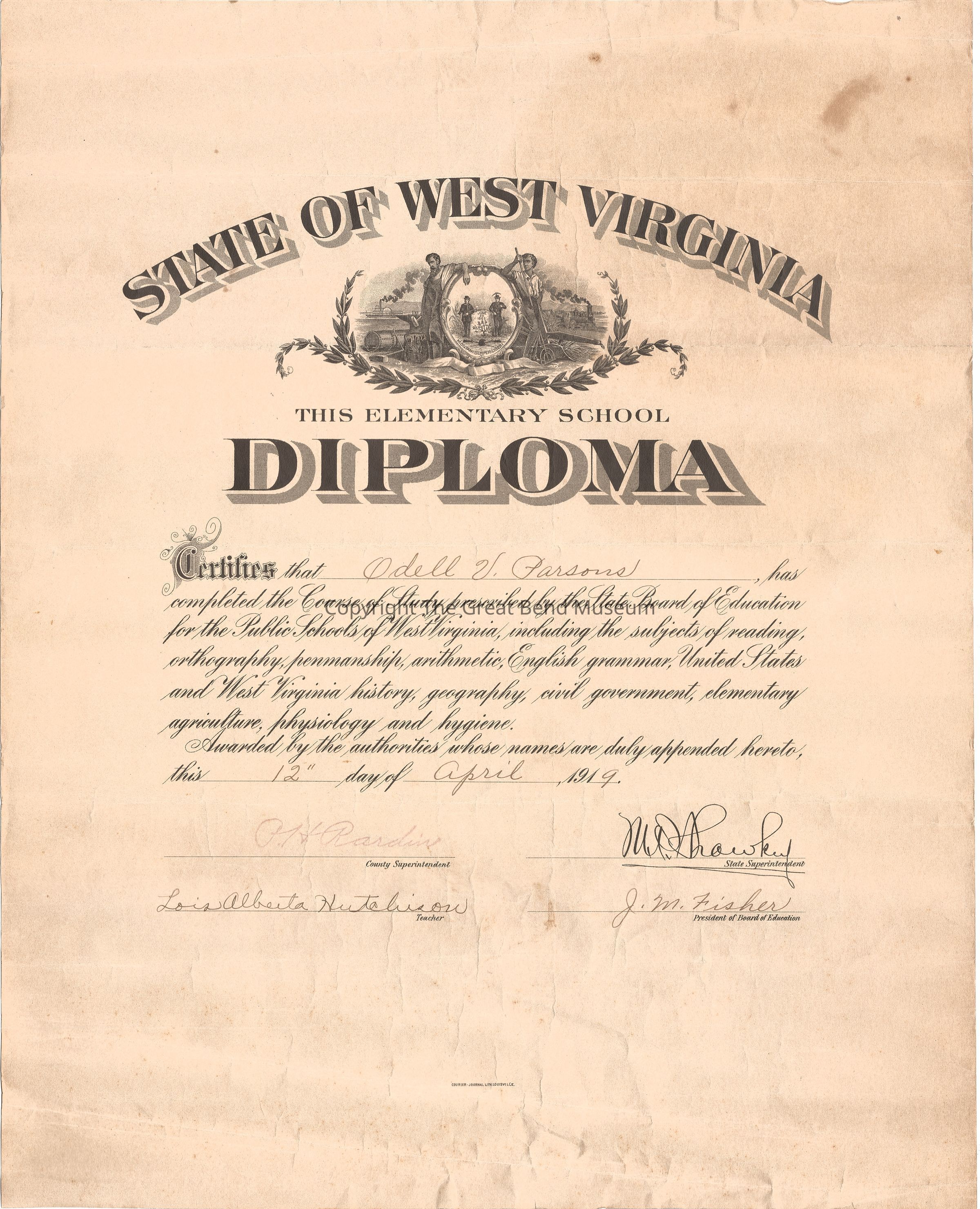 State of West Virginia This Elementary School Diploma: for Odell V. Parsons on 12th Day of April, 1919.