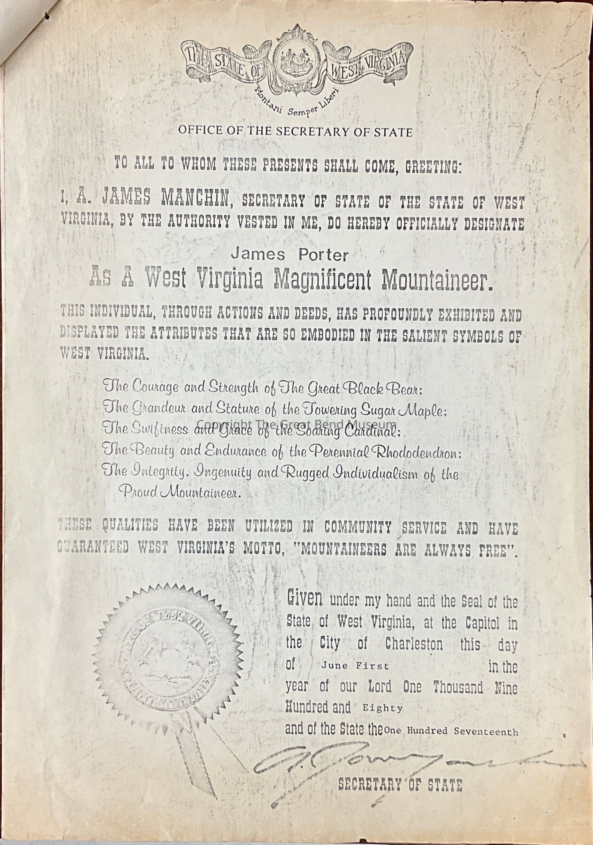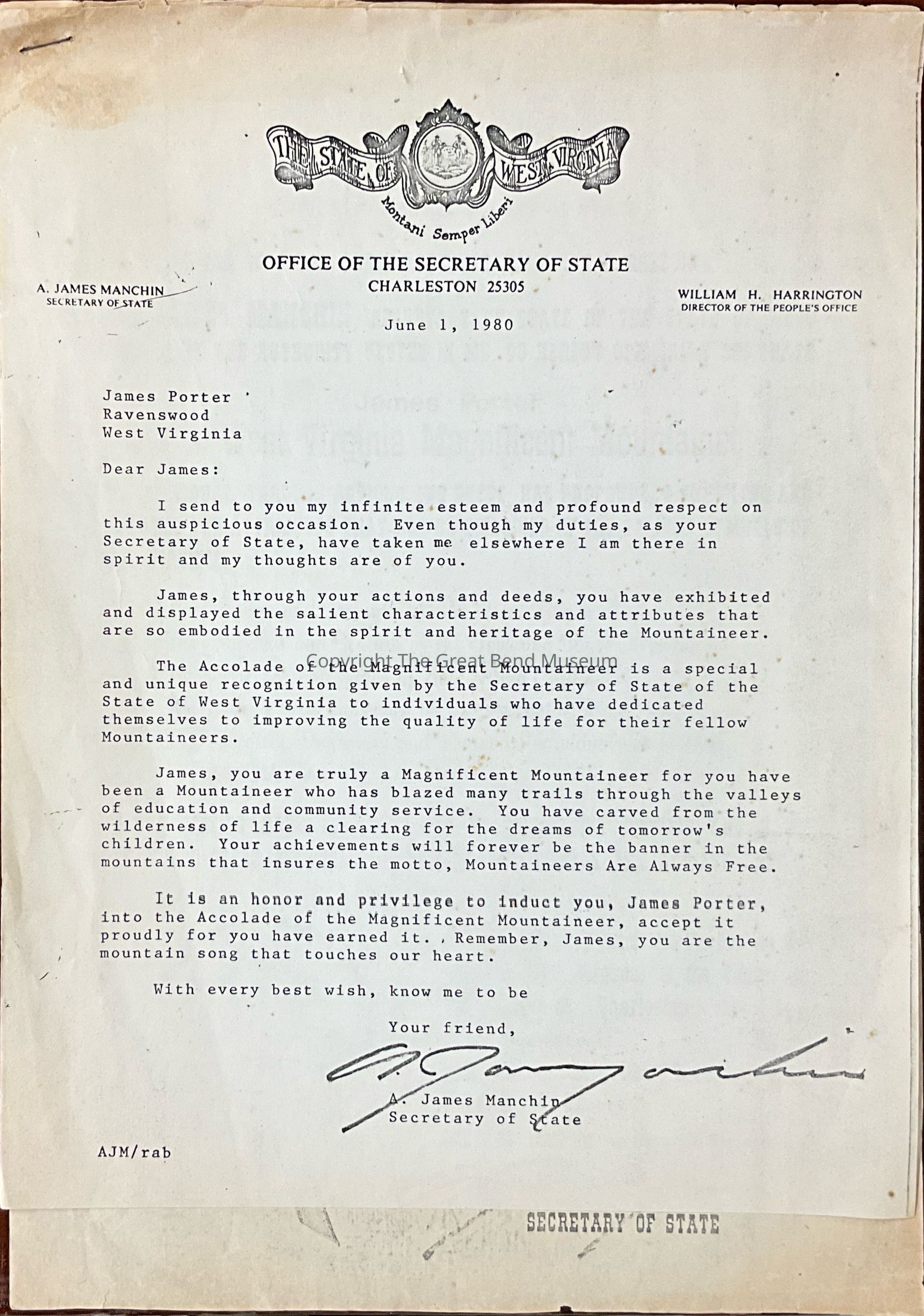 Letter to Jim Porter awarding him with the Magnificent Mountaineer AwardAcquisition