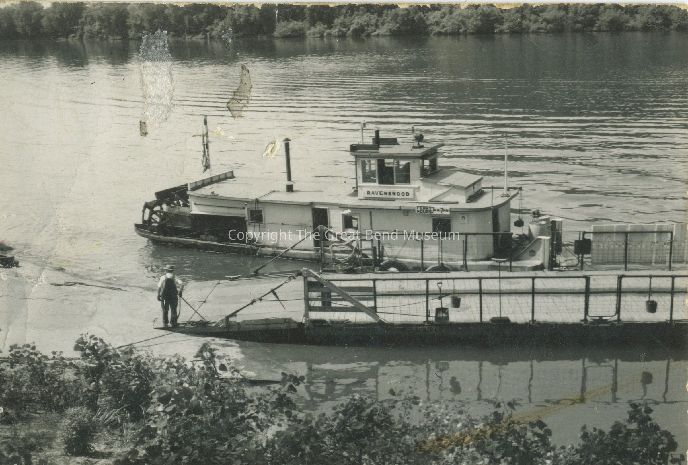Photo of Ravenswood ferry at dock and there is a man standing beside it. The opposite riverbank is just visible along the upper edge.Acquisition
