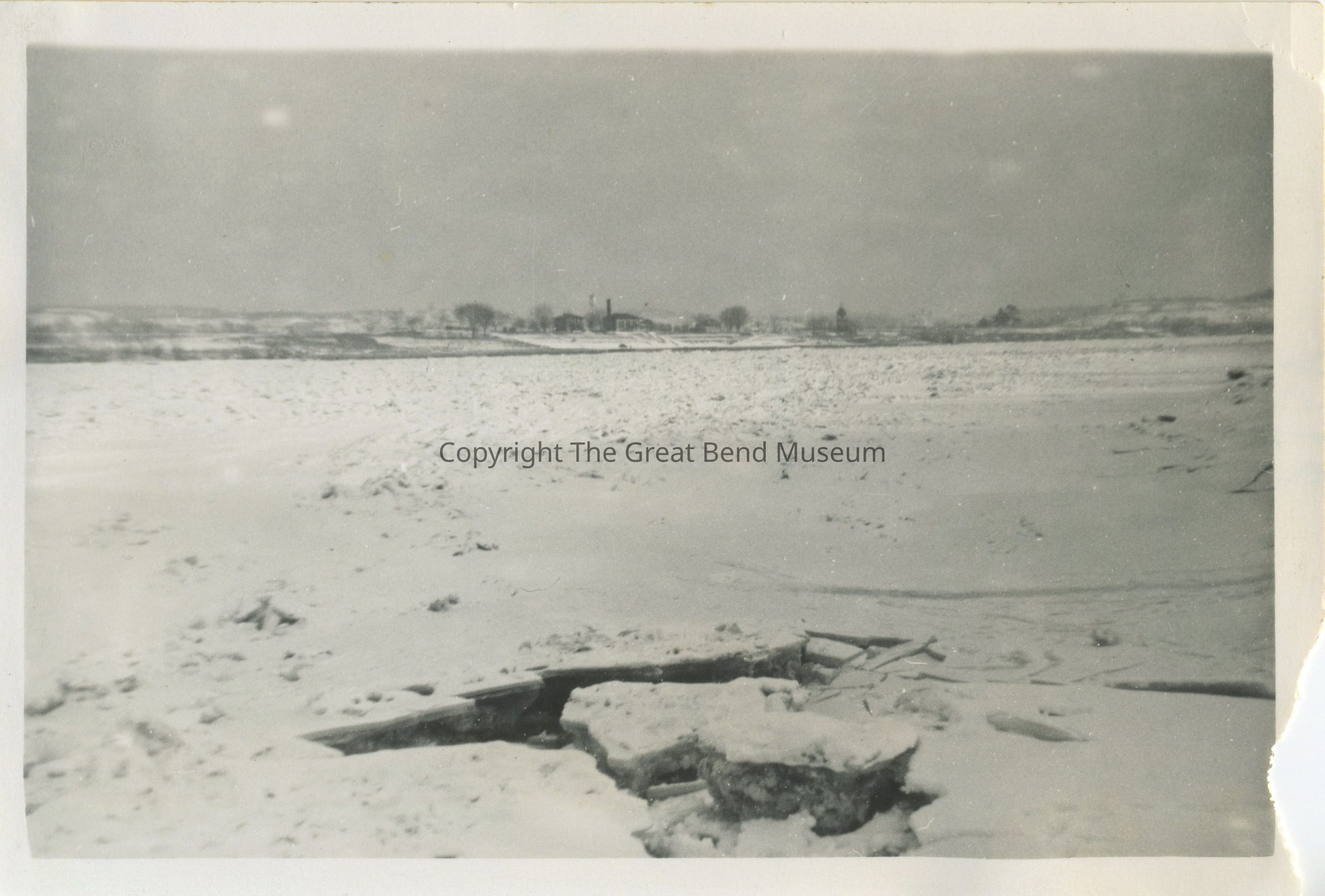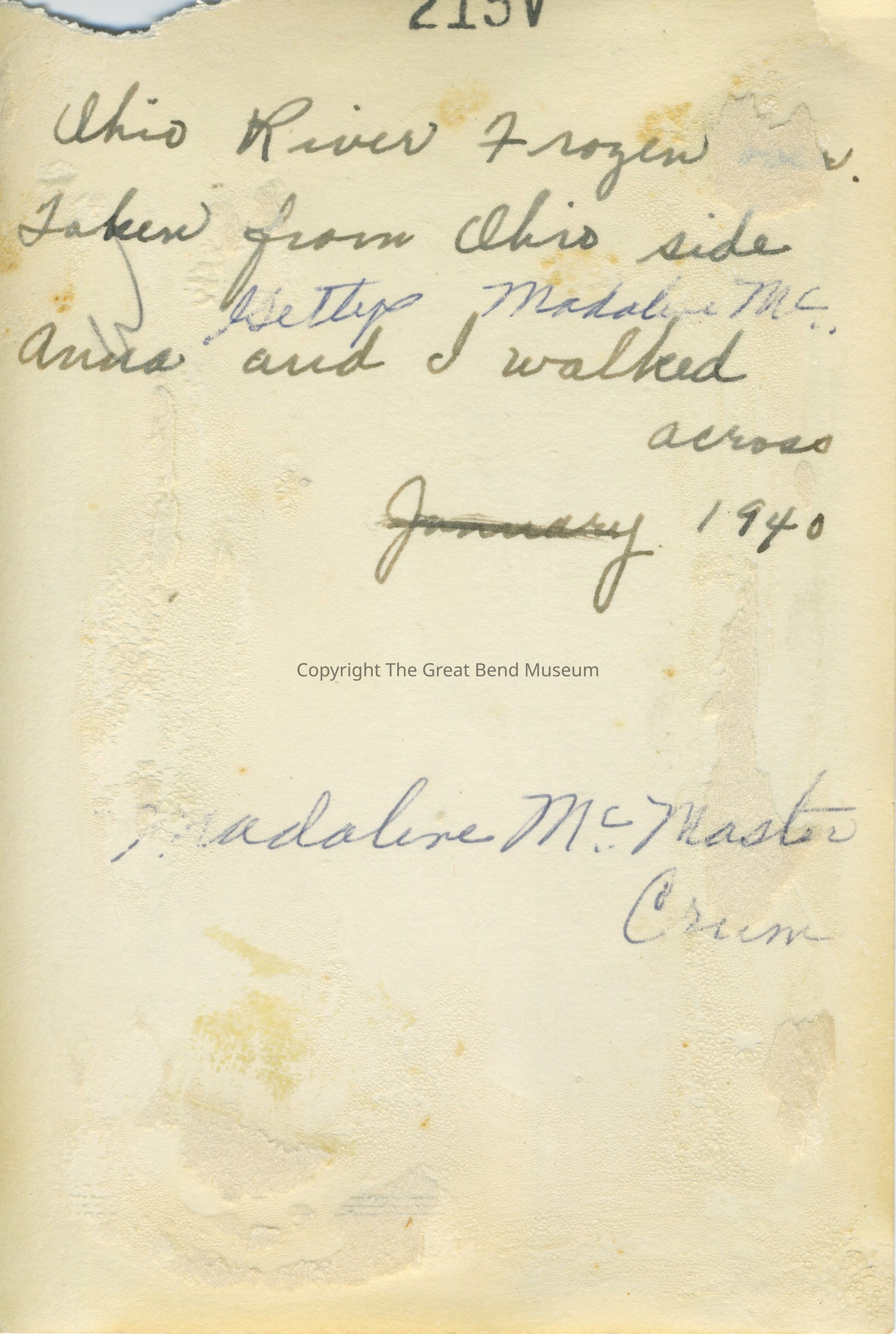 Ohio River frozen over. Taken from the Ohio side. Front center of photo are ice cracks. West Virginia side background has Ravenswood Lock House and landscape. On the back is " 215v, Ohio River frozen over. Taken from the Ohio side, Anna and I walked across. January 1940." Madaline McMaster Crum (Signed in ink). It has a white boarder, set of 2 photos.Acquisition