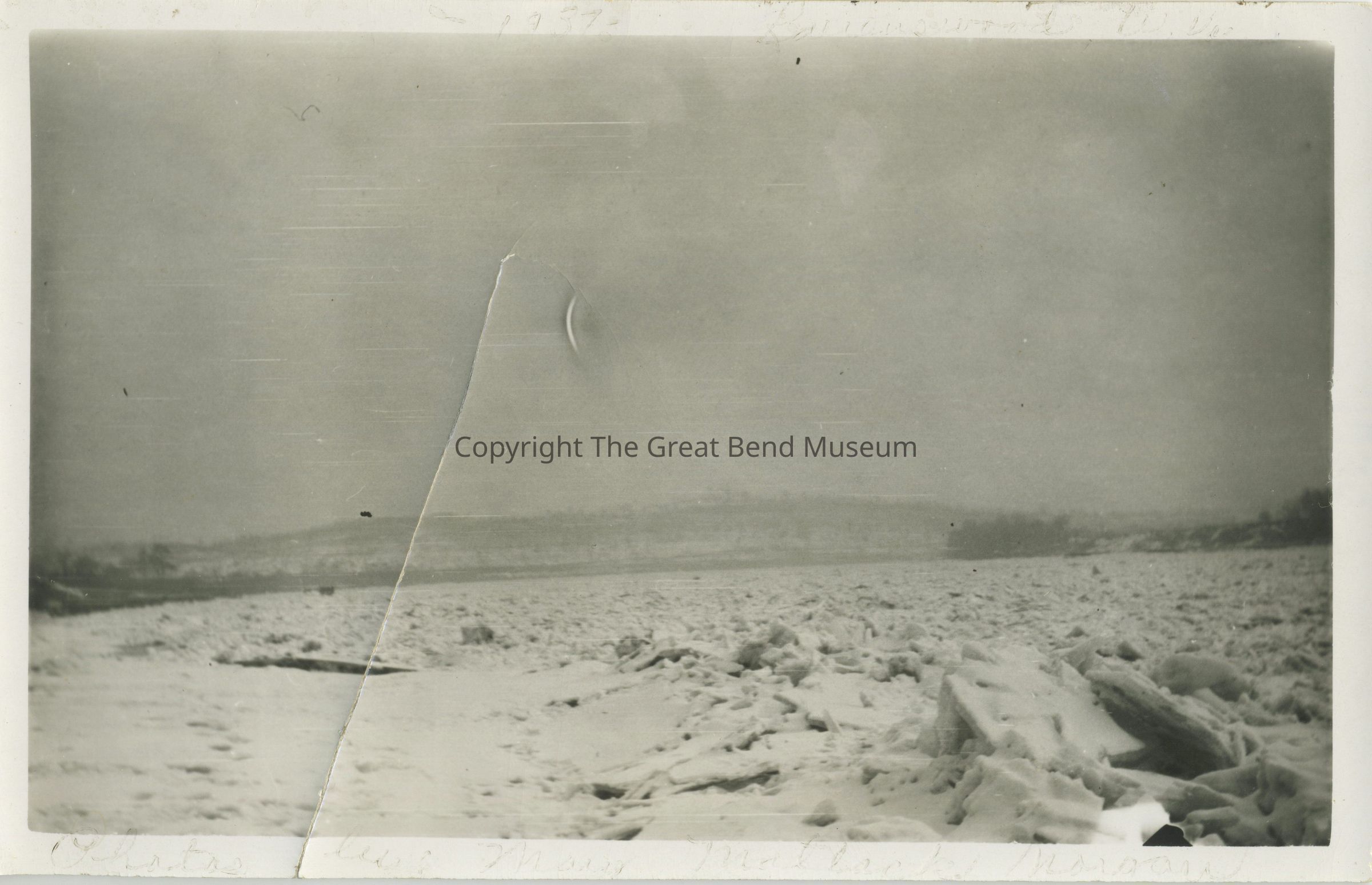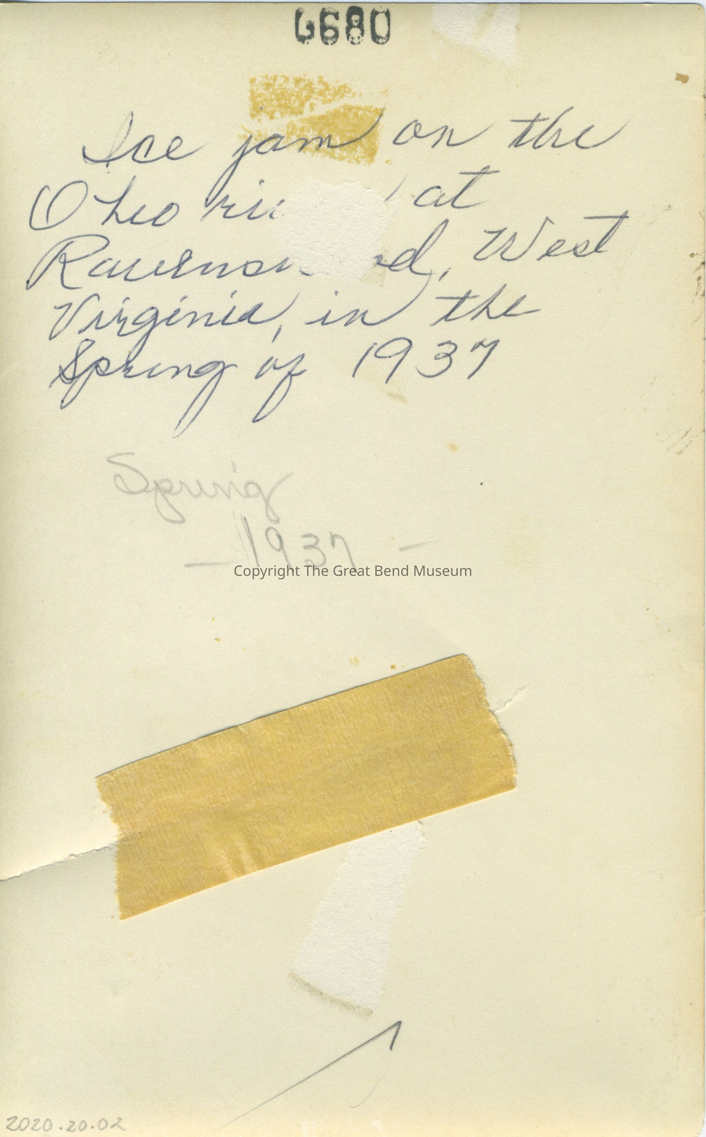 B/W photo - white border - Ohio River - ice jam. Back: "G680" "Ice jam on the Ohio River at Ravenswood, West Virginia, in the spring of 1937" "Spring 1937" Front (border ink faded) "1937 Ravenswood W.Va." "Photos by Mary Matlock Morgan"Acquisition