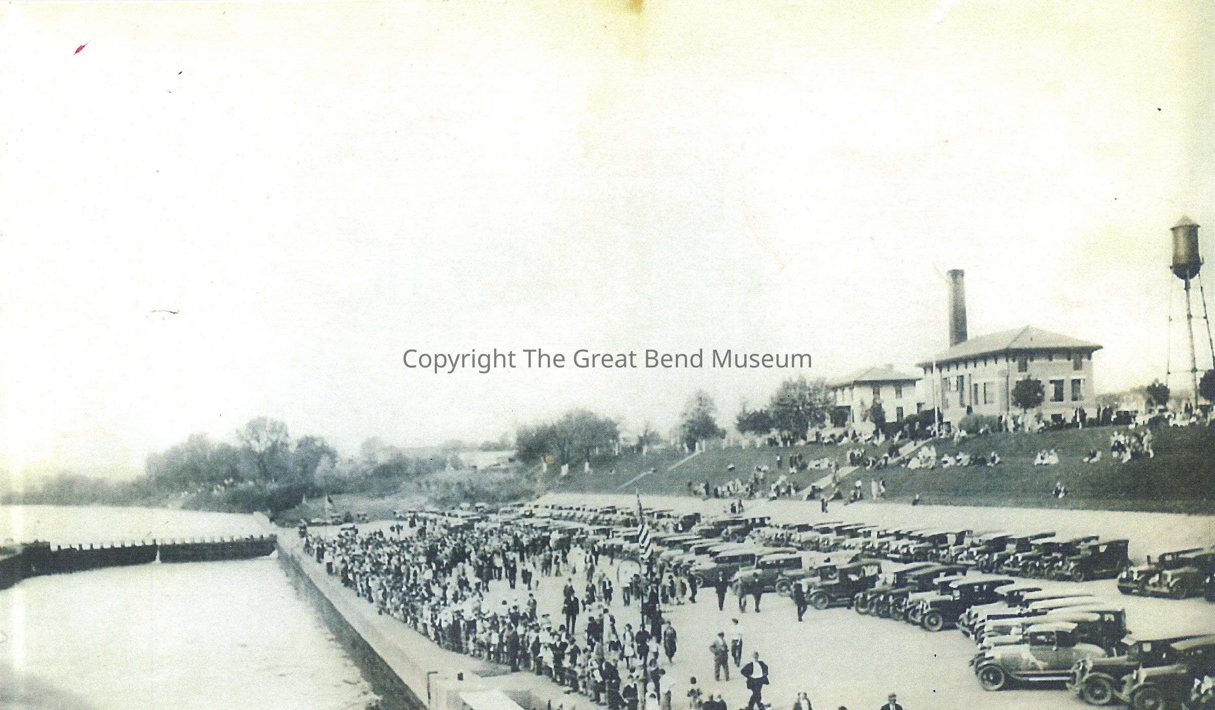 Photo of concrete esplanade on the banks of the Ohio River crowded with hundreds of people, cars, lock house, and lock master's house center right atop slope. Wicket dam visible center left.Acquisition
