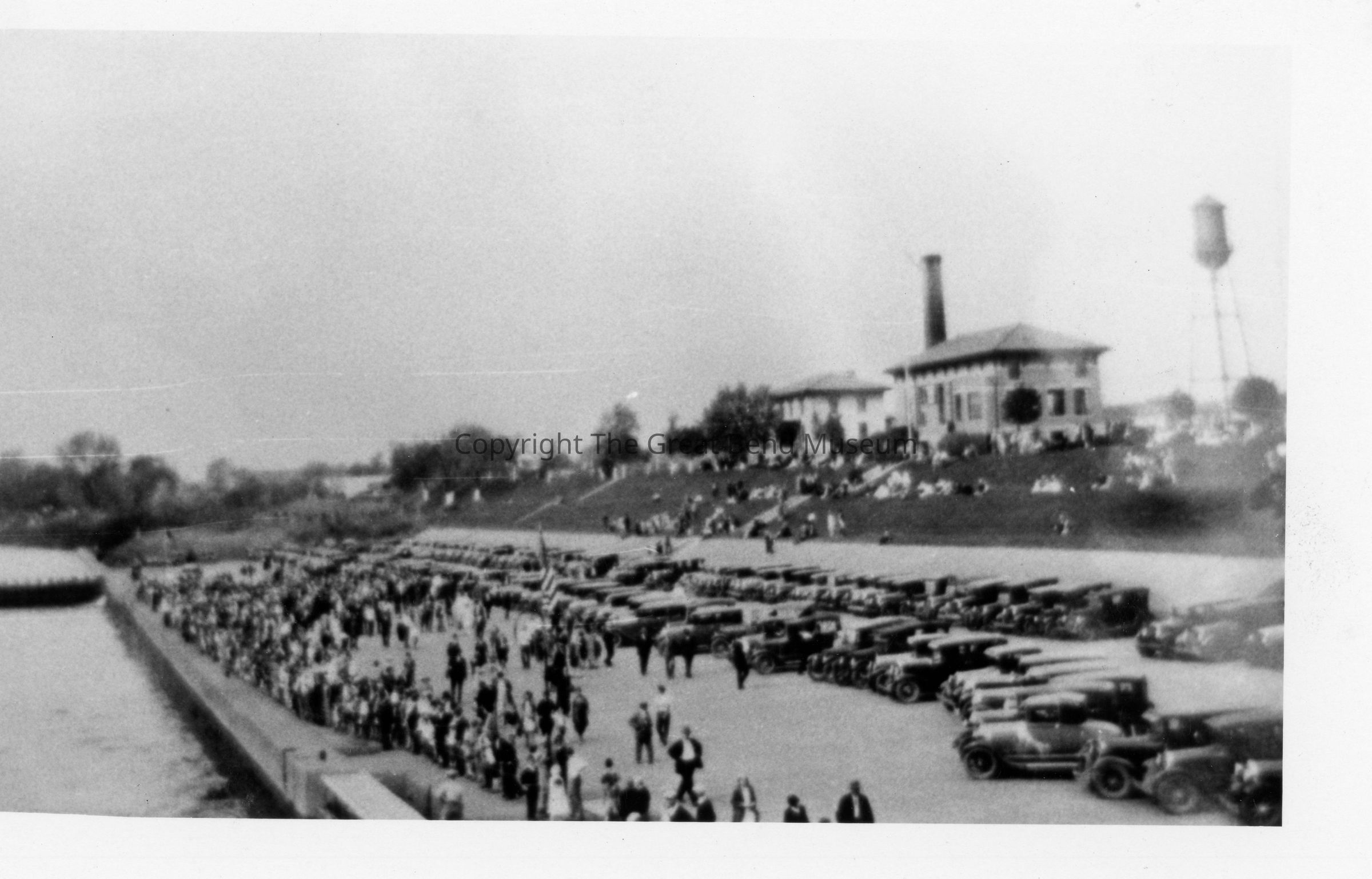 Photo of group of people and cars along the river in front of the Lock House. People also sitting on the grass bank. There is a water tower to the right of the Lock House, and on the left is the Lock Master House. Also larger copy of same.Acquisition