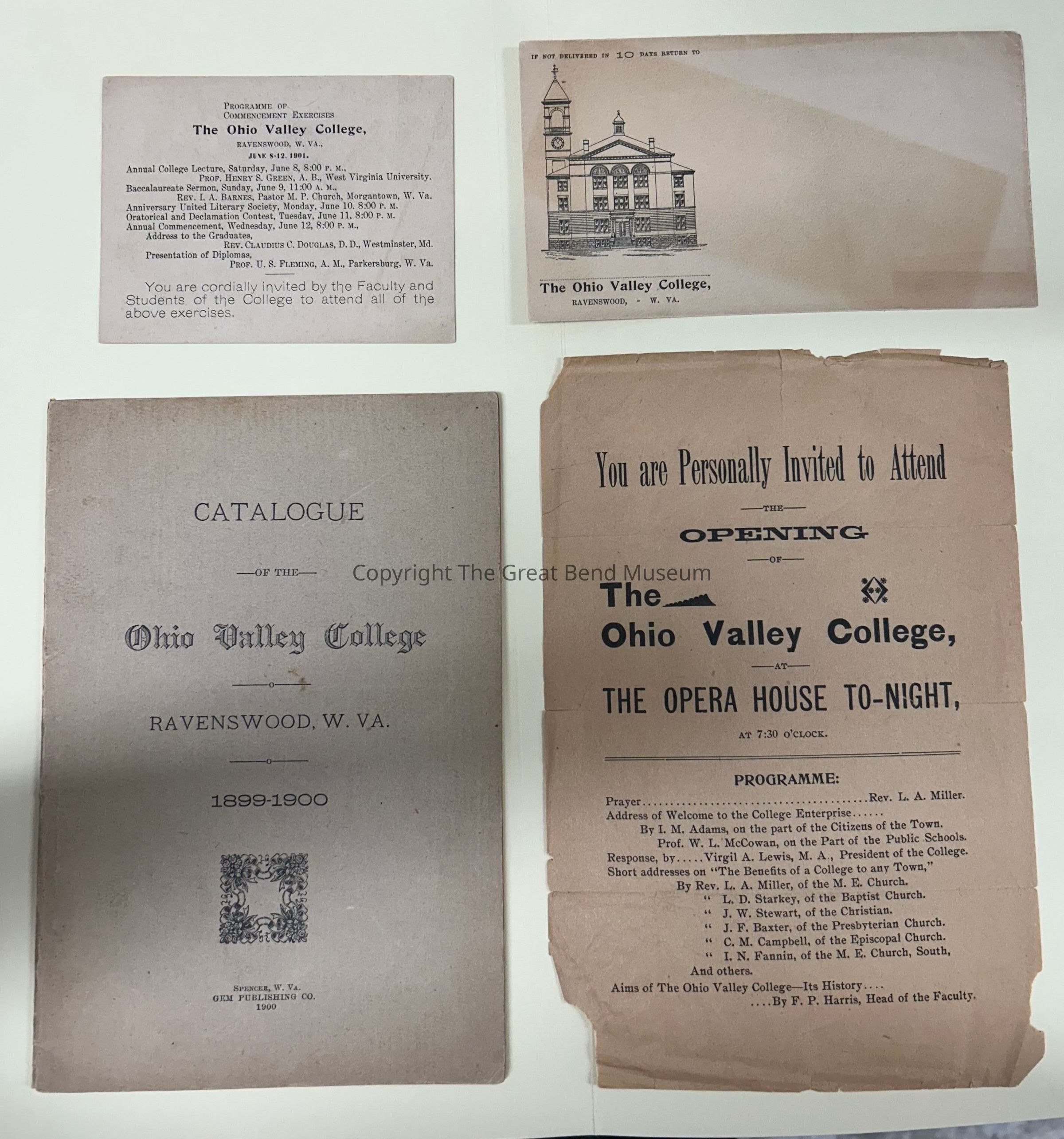 Graduation Announcement The Ohio Valley College of Ravenswood, WV - June 8-12, 1901 at 8:00 pm. 4 days of exercises including Baccalaureate, Sermon, Graduation. Envelope with picture of the Building of the Ohio Valley College.Date(s) of Creation