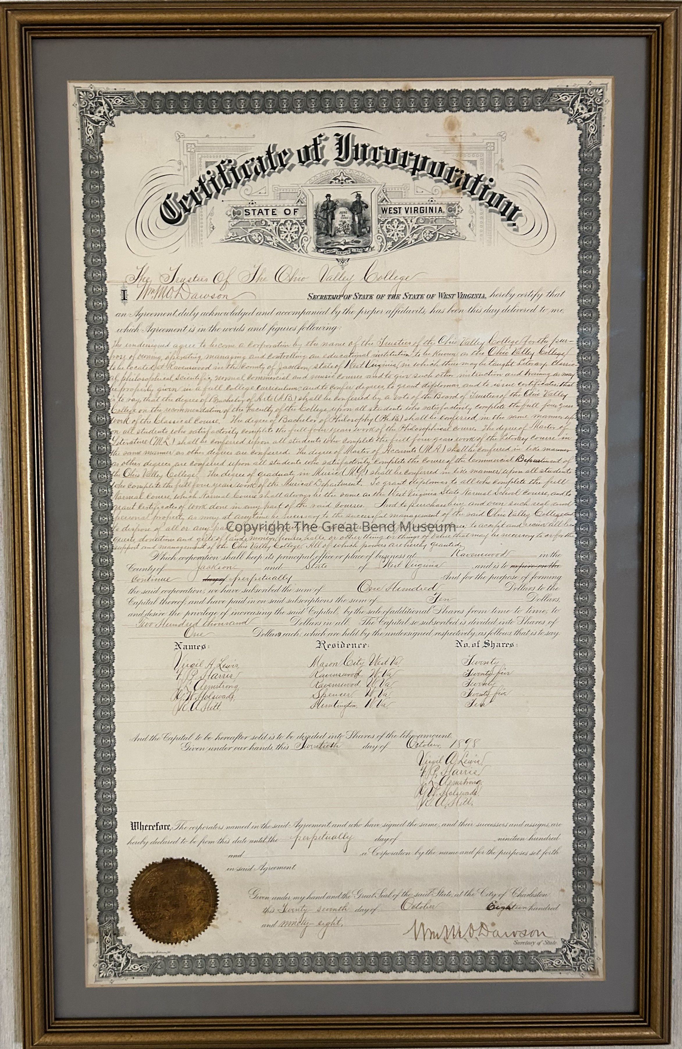 Titled, "Certification of Incorporation" This document is a certificate to become a corporation. It was made for the Ohio Valley College and is signed at the bottom by Wm. M O Dawson Secretary of State.