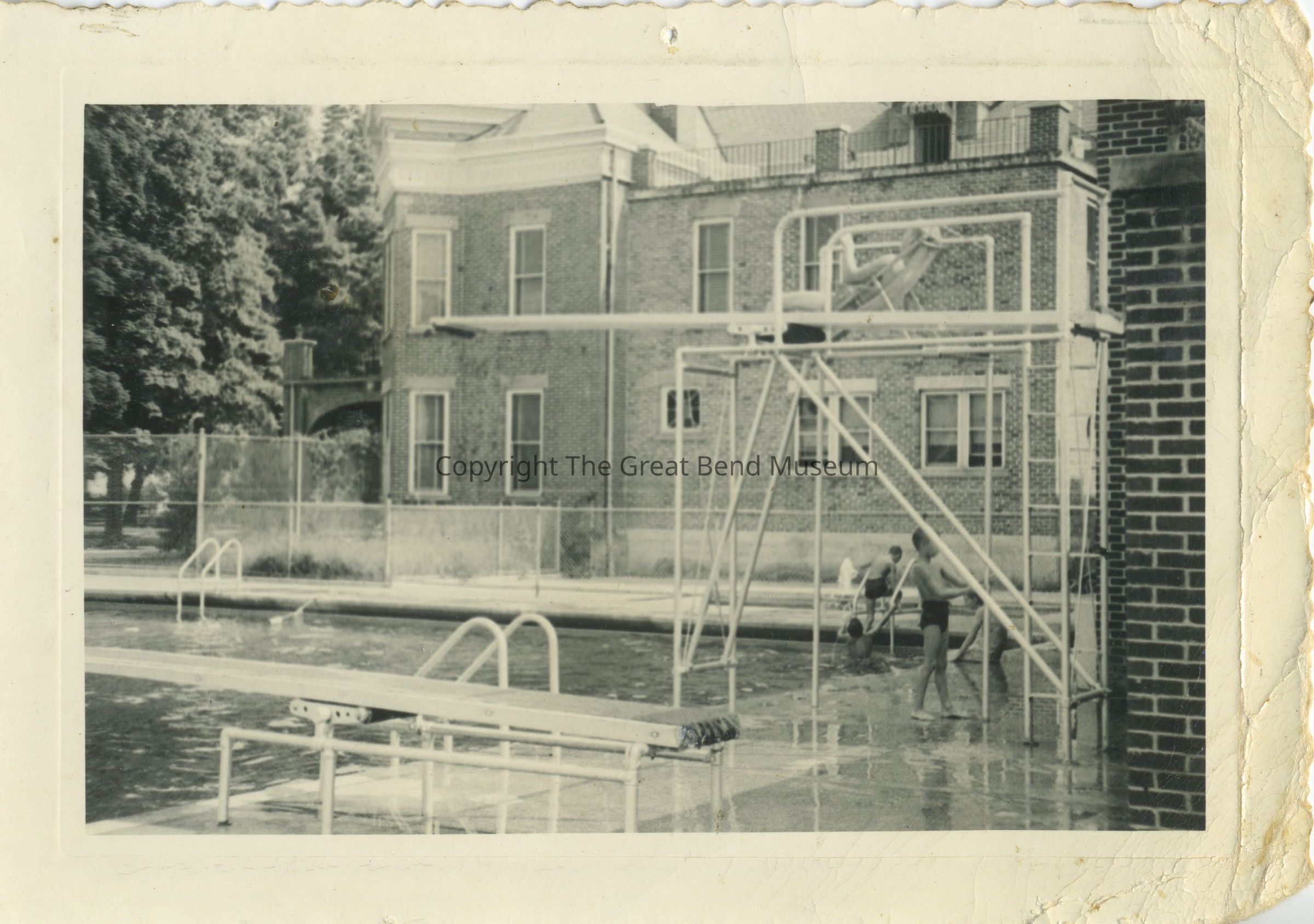 Black/White photo - ruffled edge cut - white border. Lifeguard stand - Male lifeguard in chair by high dive - 4 boys in deep end - right edge of pool/picture McIntosh Building in background. Back stamped "60"