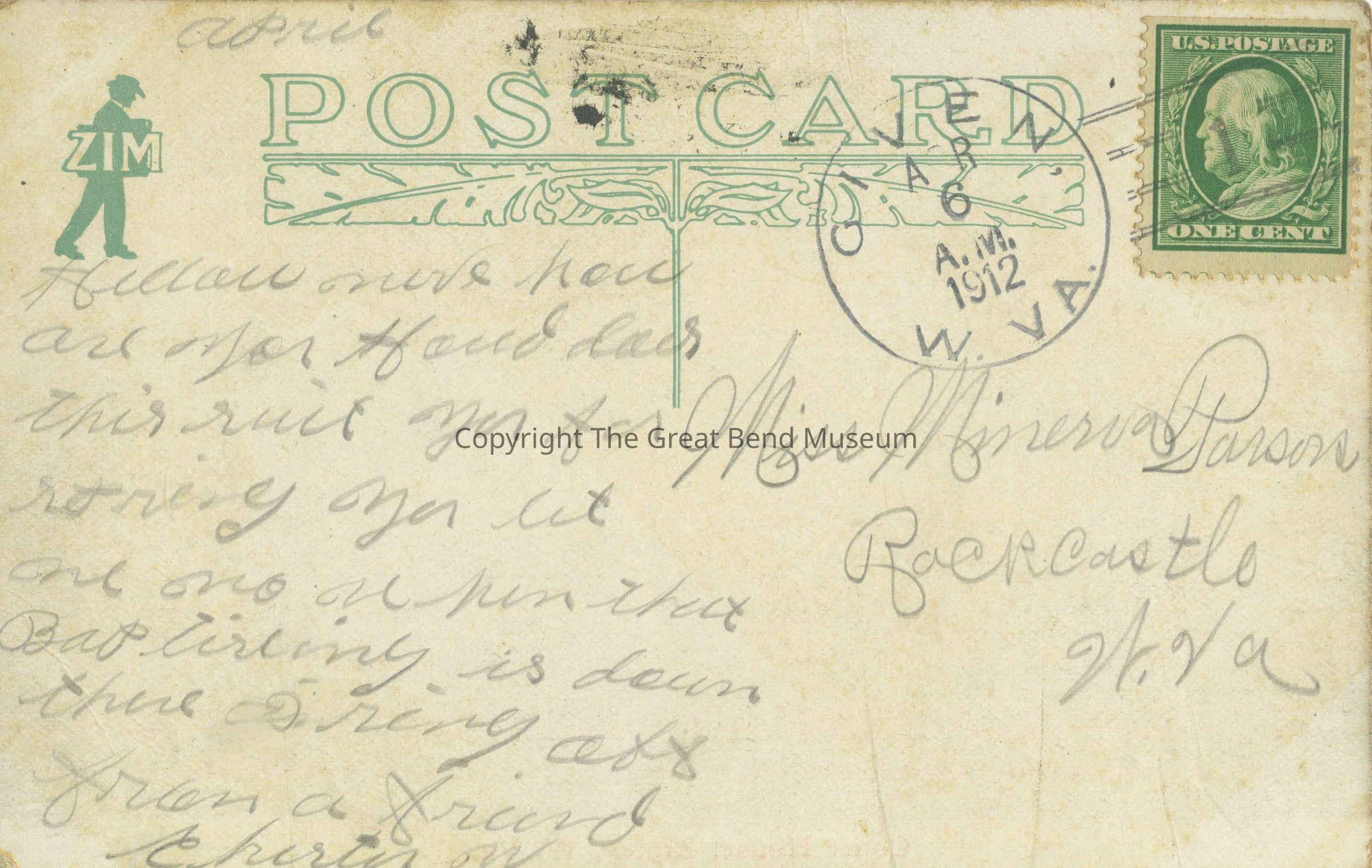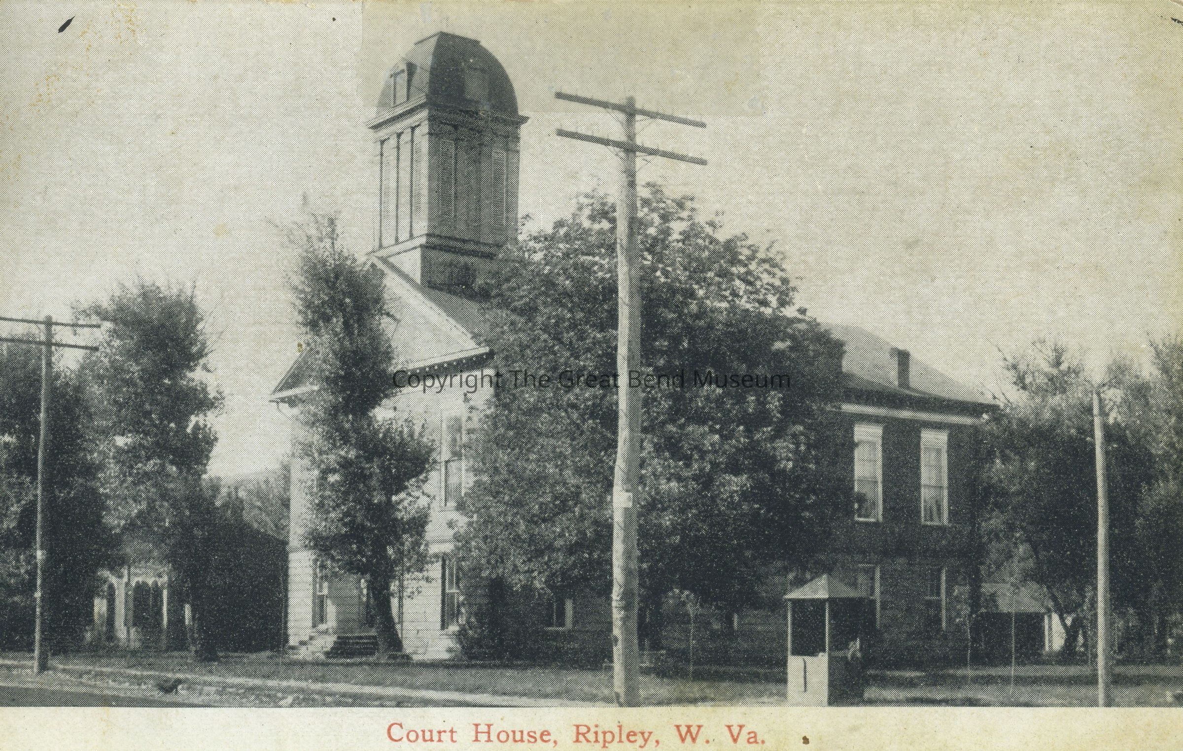 B/W photo postcard of Jackson County Court House, Taken at angle of Court Street from right side "end" of building. Front: "Court House, Ripley, W.Va." in red type. Back: "April" "Hellow Merve, how are you (?) if and does this suit you for [? ] You let me no [ ] him that baptizing is down there. [? ] ring off. from a friend [ ] Sent to Miss Minerva Parsons, Rockcastle, W. Va.