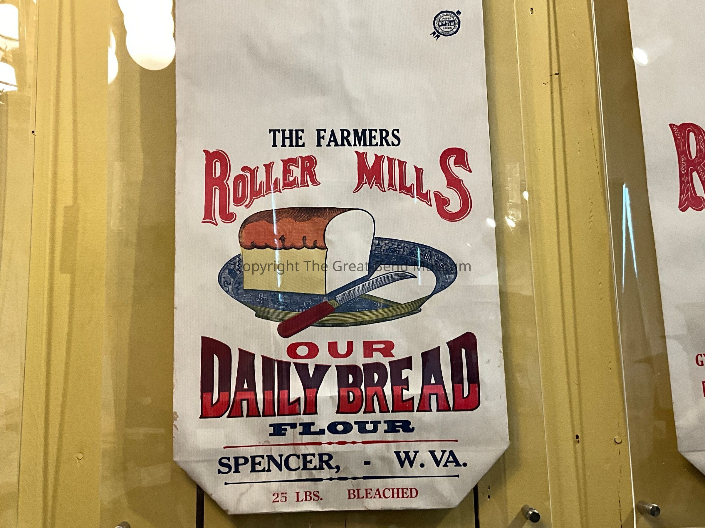 Flour Sack - large white "The Farmers Roller Mills" "Our Daily Bread" "Flour from Spencer, W.Va." on label. Has picture of loaf of bread on a plate with a knife for slicing. The ink is red, yellow, and blue. "25 lbs. bleached"Acquisition