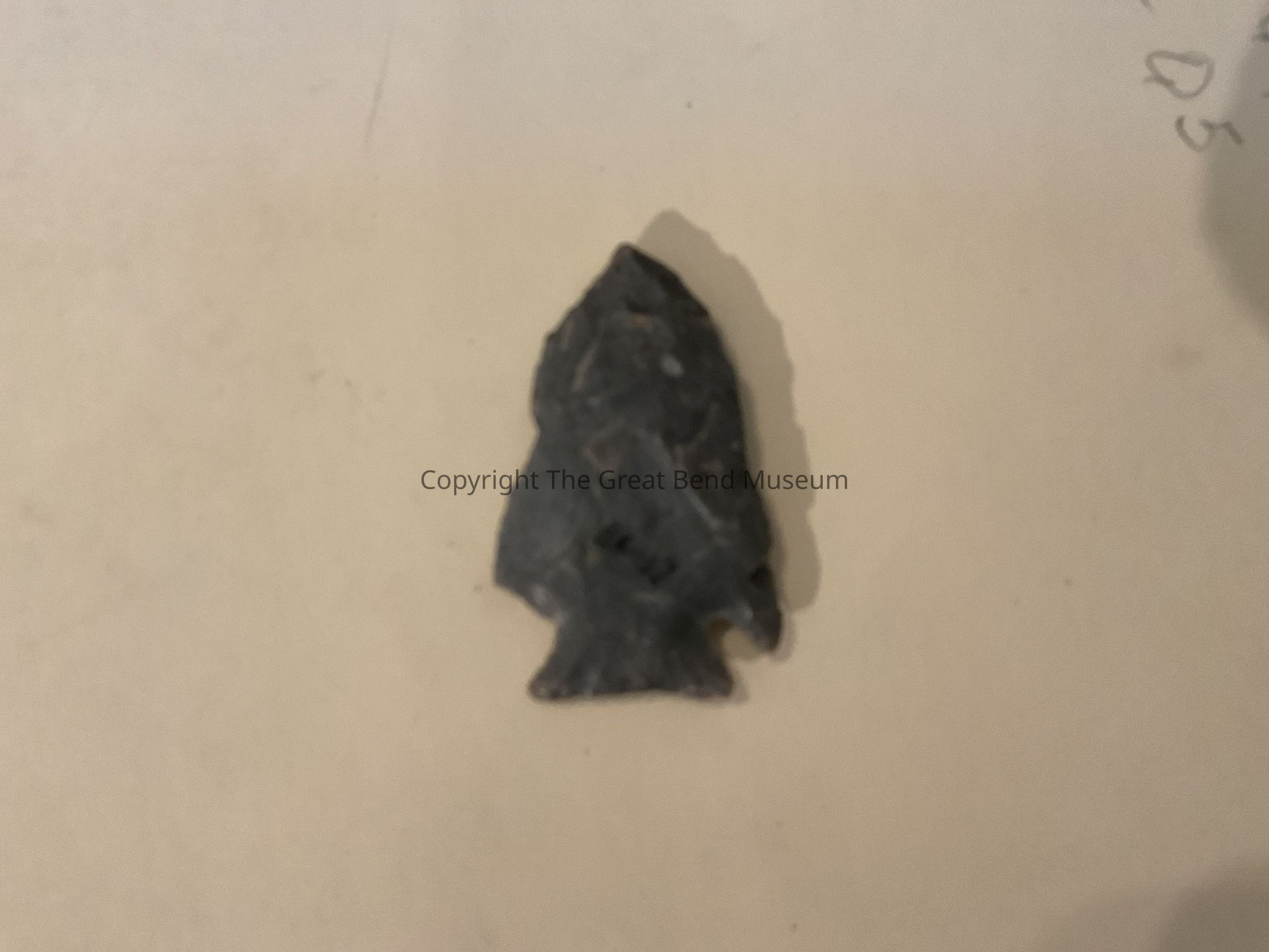 Dark gray medium sized point. Blade edge generally serrated. Shoulders are barbed. Stem is ground and flares on sides. One corner of stem is chipped. Could possibly be a Kirk Corner Notched Point.Acquisition