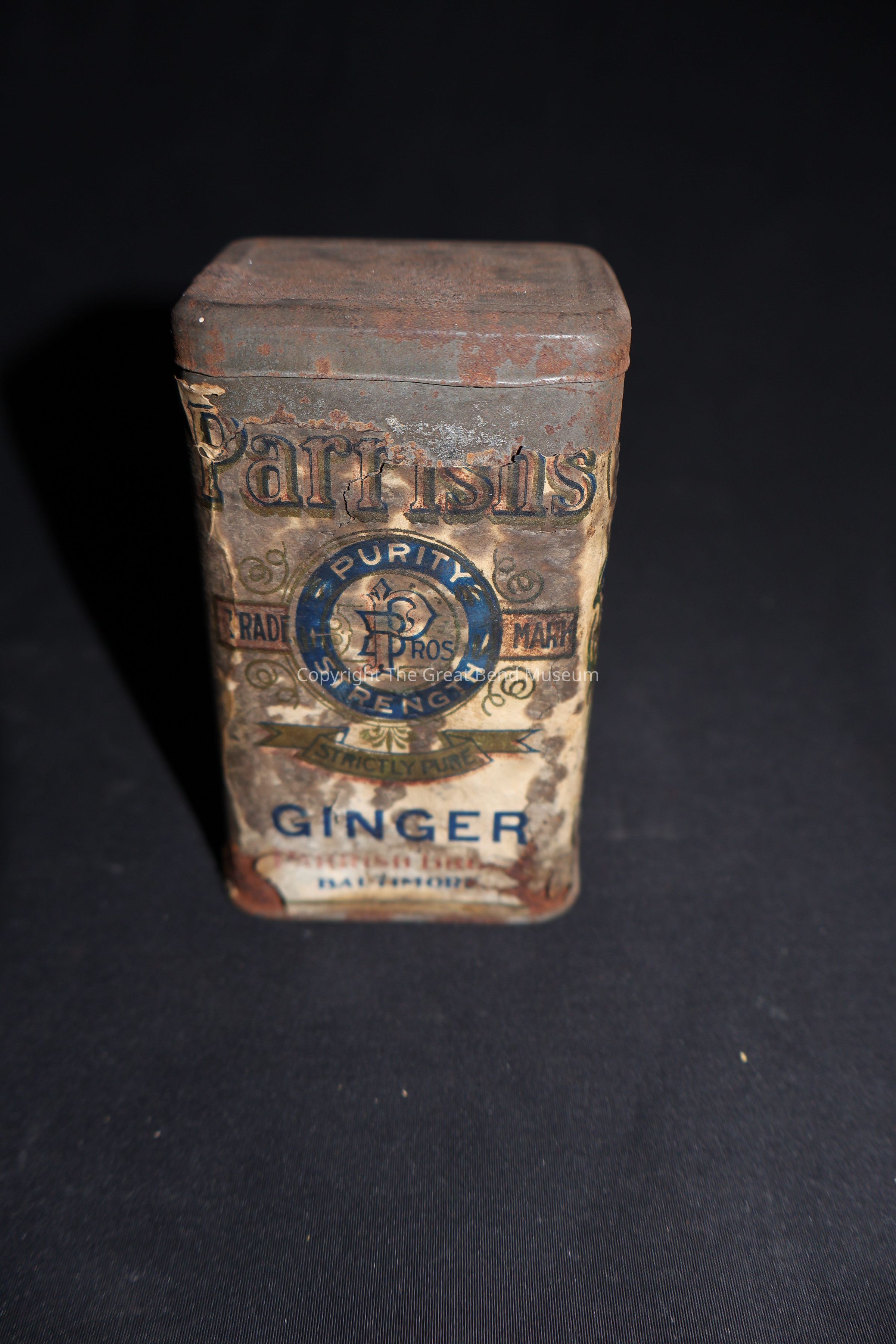 Paper falling apart. Can make out ginger blue writing. Side says guaranteed under the Food and Drug act no.377 June 30, 1906. Full of metal triangles. Side panel Parrish's (blue flag white lettering) (Blue lettering) These spices are ground from fine crude stock. Front and back Parrish's trade mark purity strength, gold banner outlined in blue reads strictly pure ginger (blue lettering) Parrish Brother's (Red) Baltimore blue lettering. Other side panel no.377 blue lettering, Guarateed under the Food and Drugs Act, June 30, 1906.Acquisition