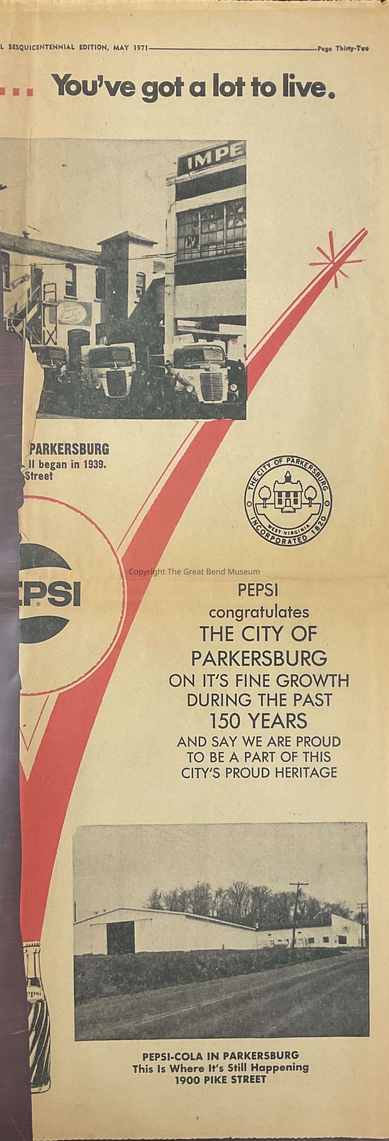 “Pepsi Congratulates The City Of Parkersburg On Its Fine Growth During The Past 150 Years”Acquisition