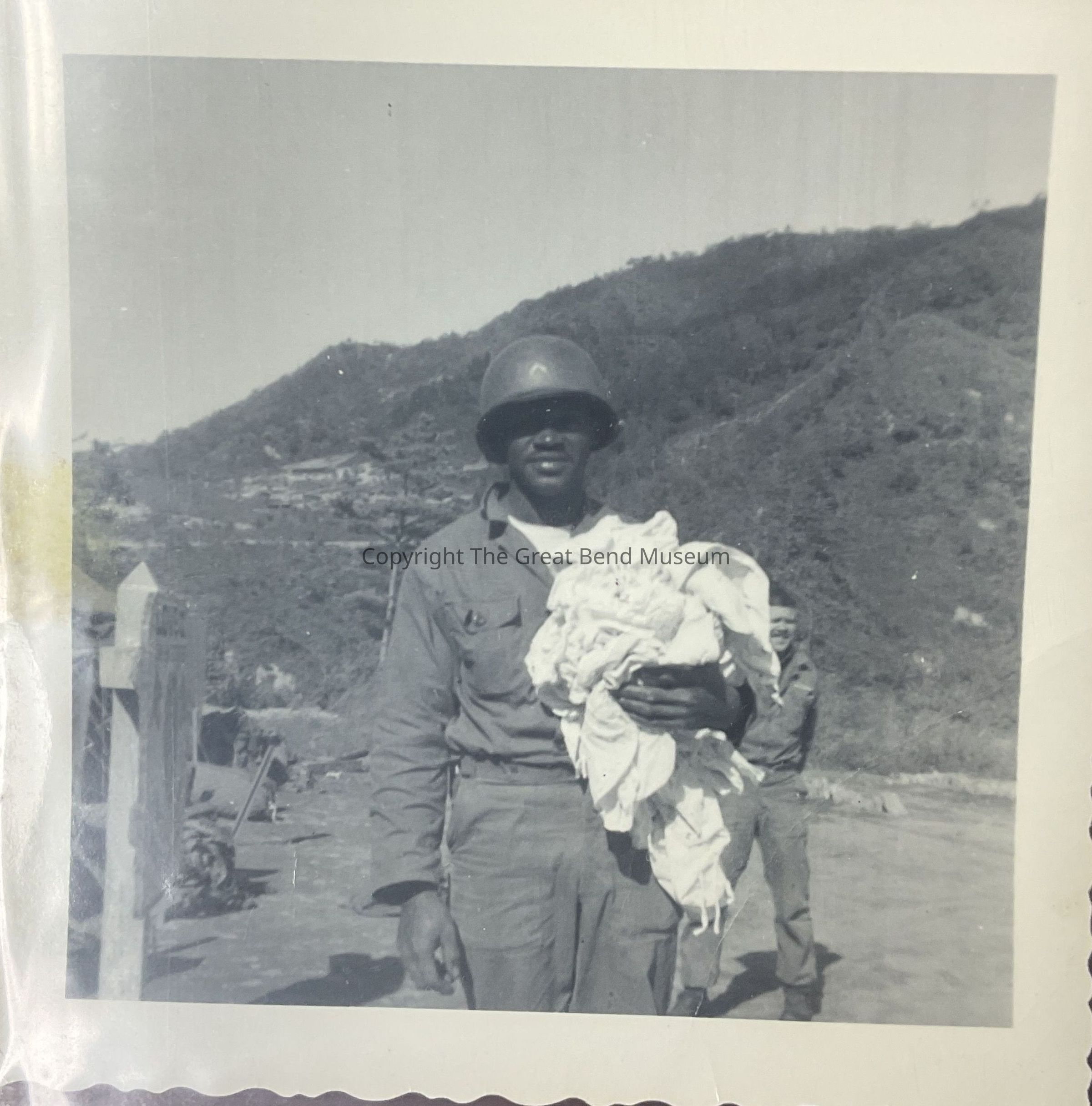 Photo of soldier holding a bundle of laundry - 1952