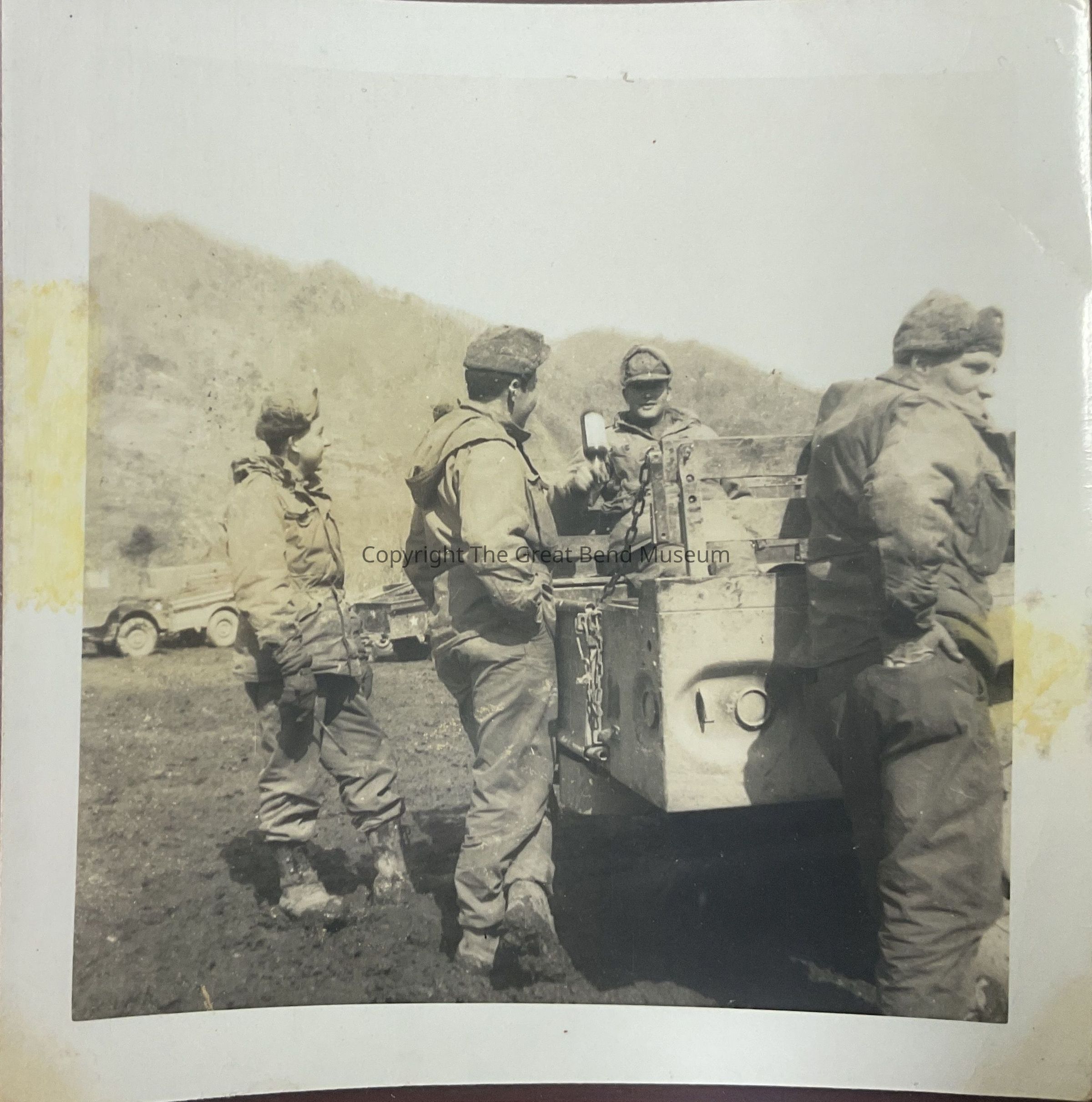 Photo of 4 soldiers standing around equipment - 1952 (3x)